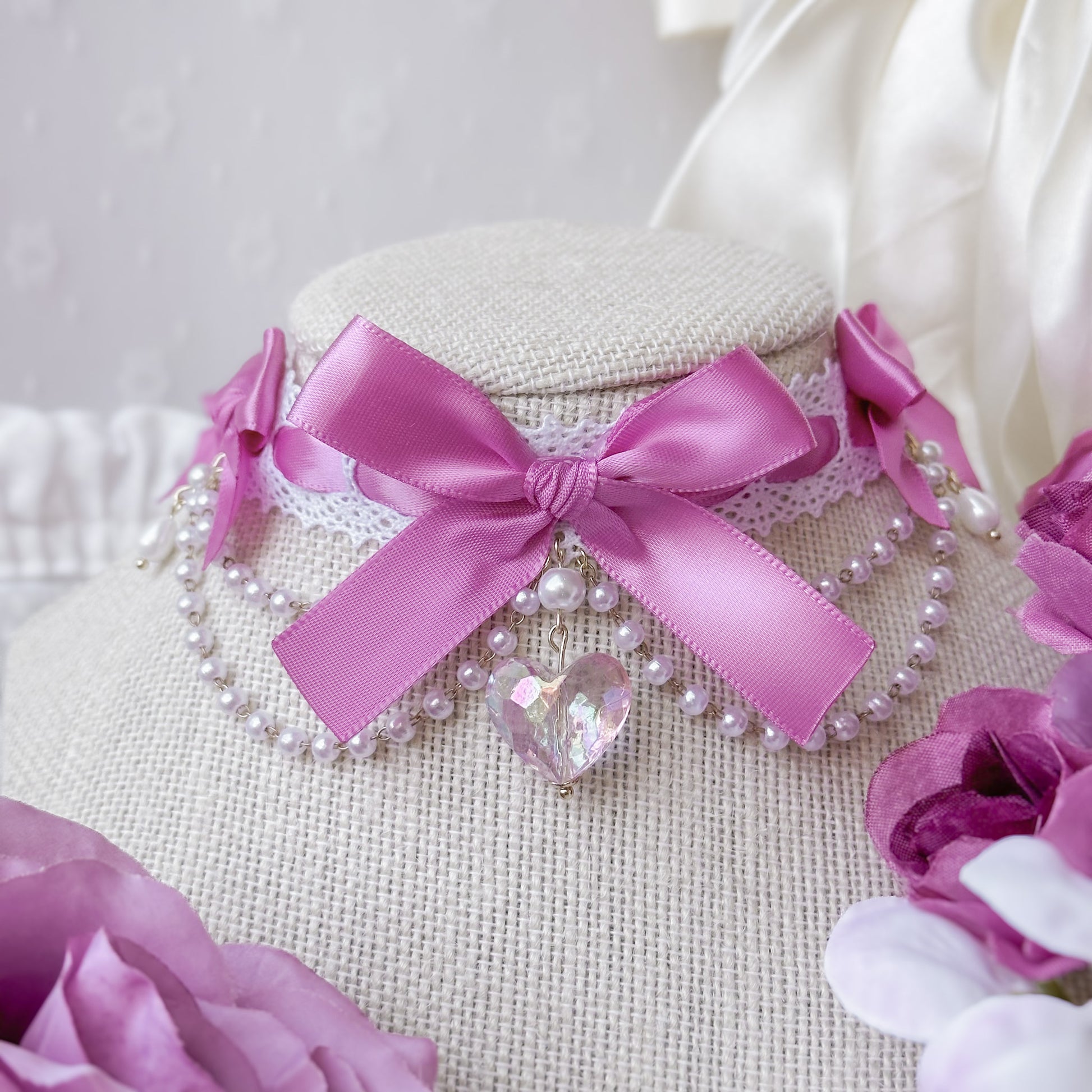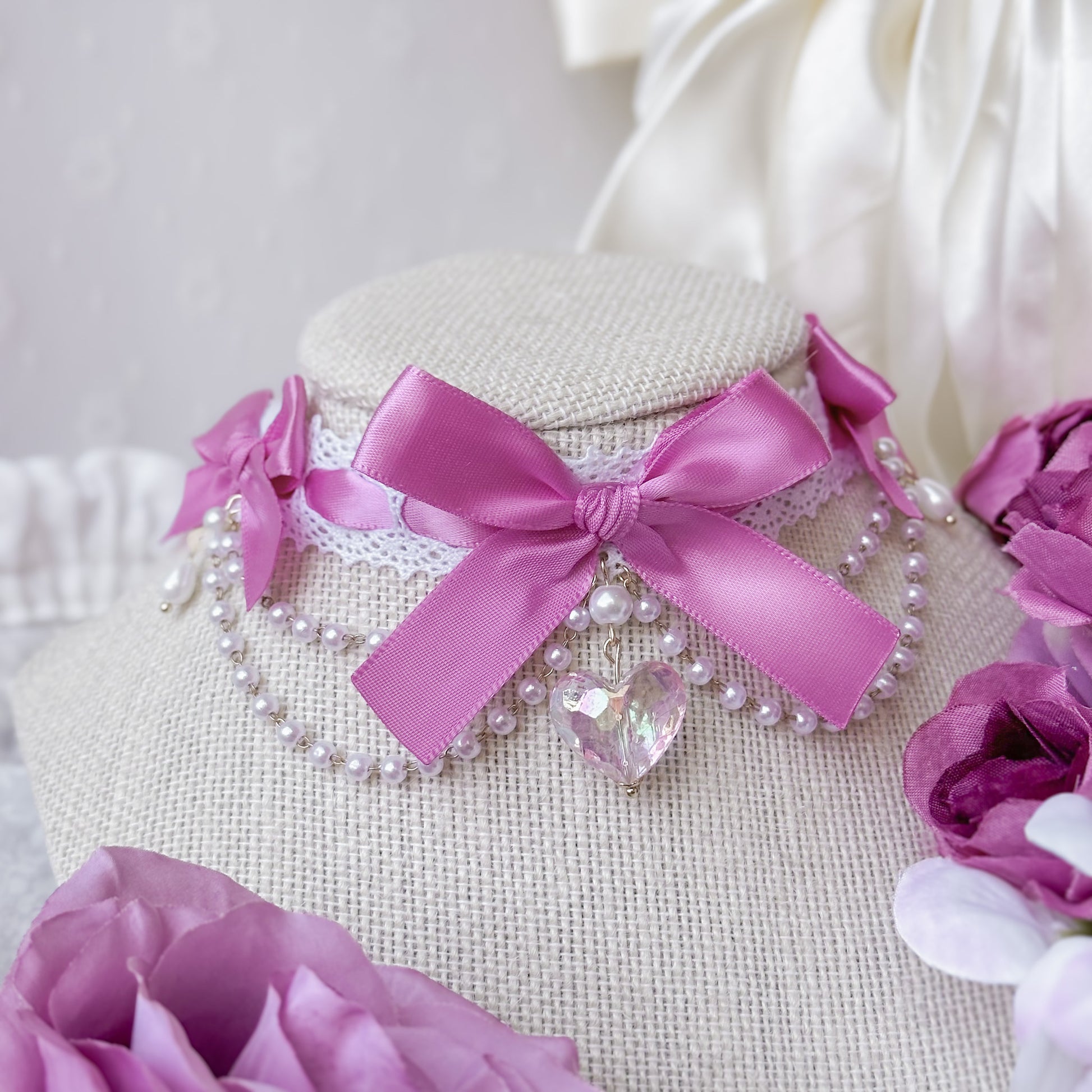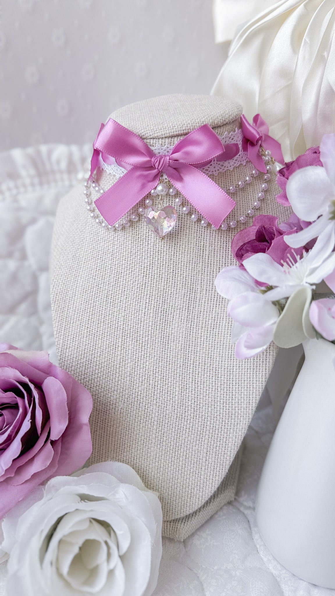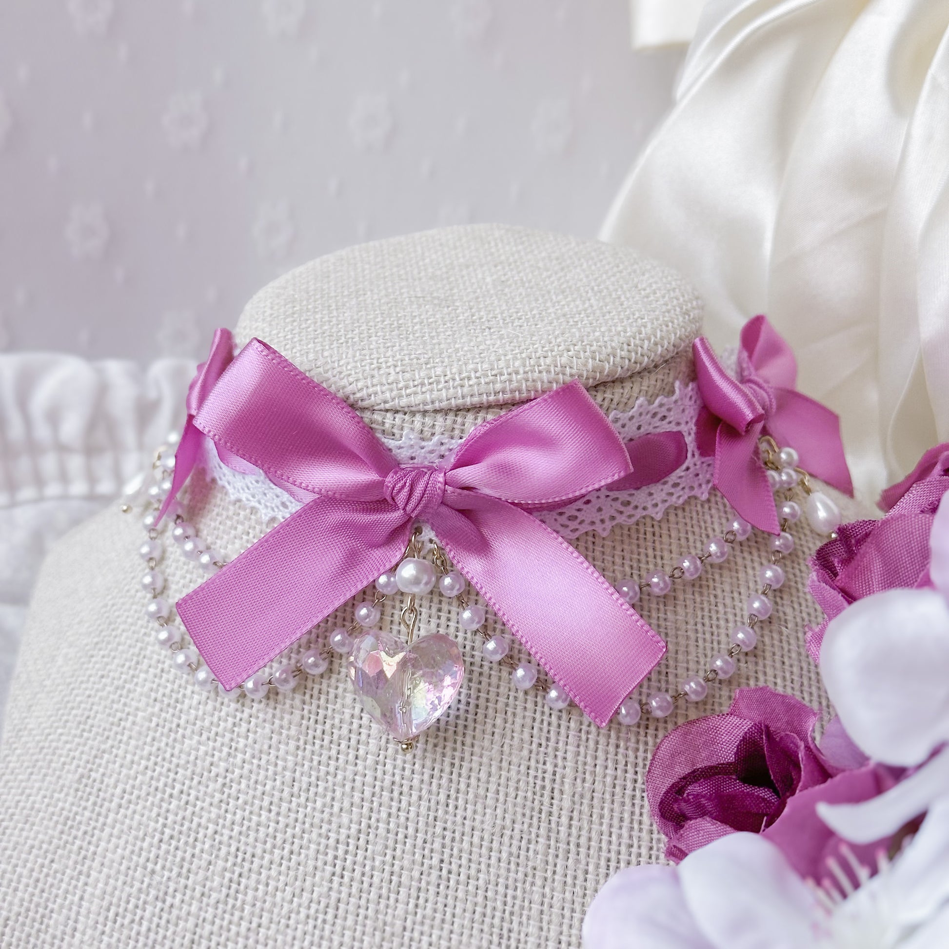 Lace choker with fuchsia pink ribbon and pearl chain.