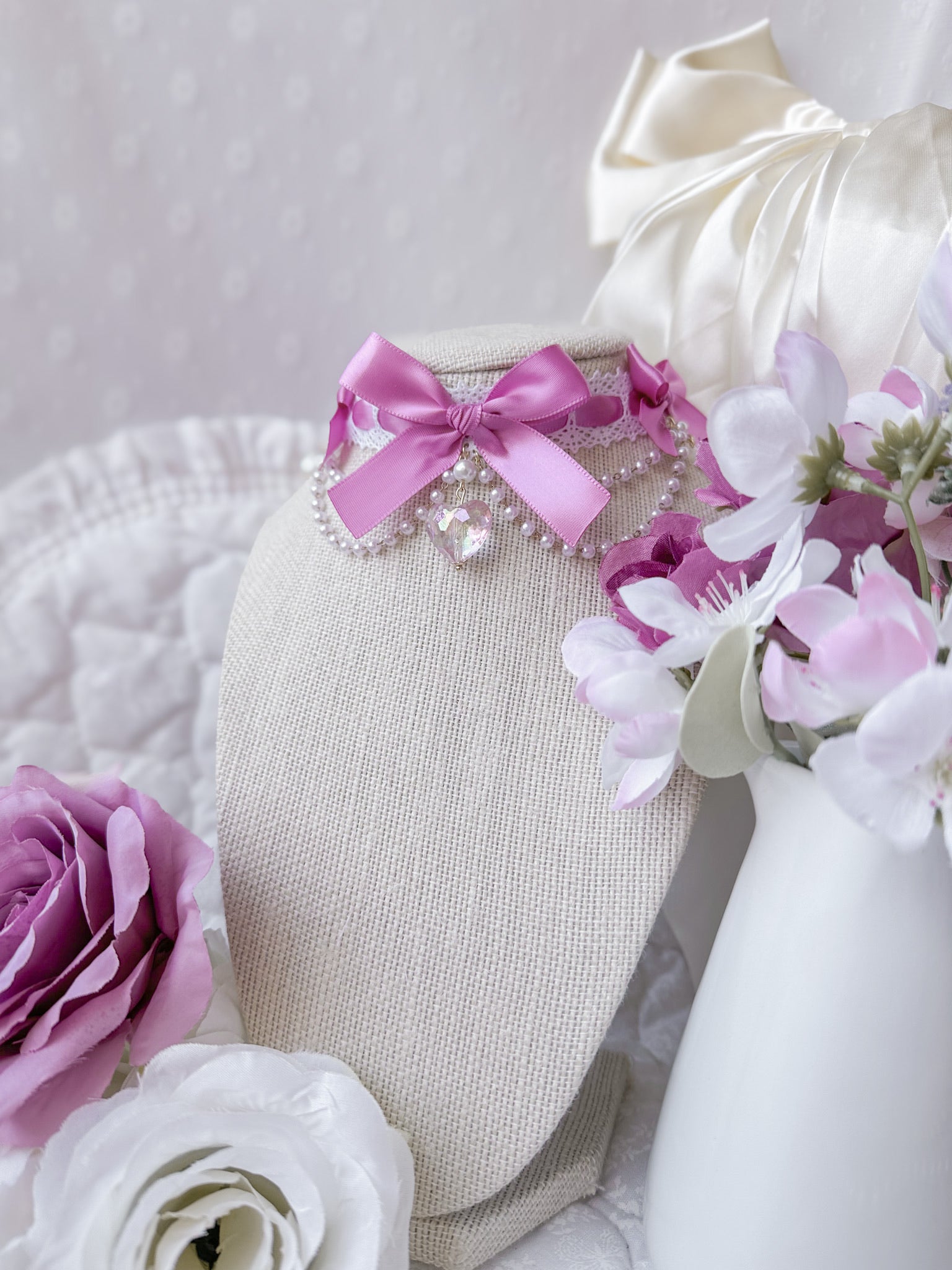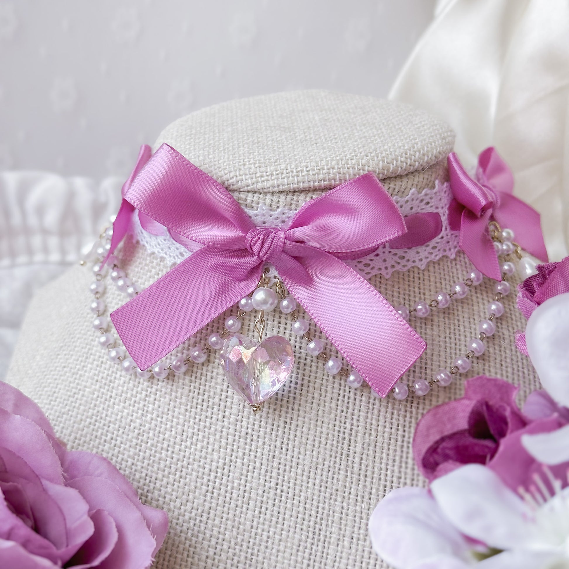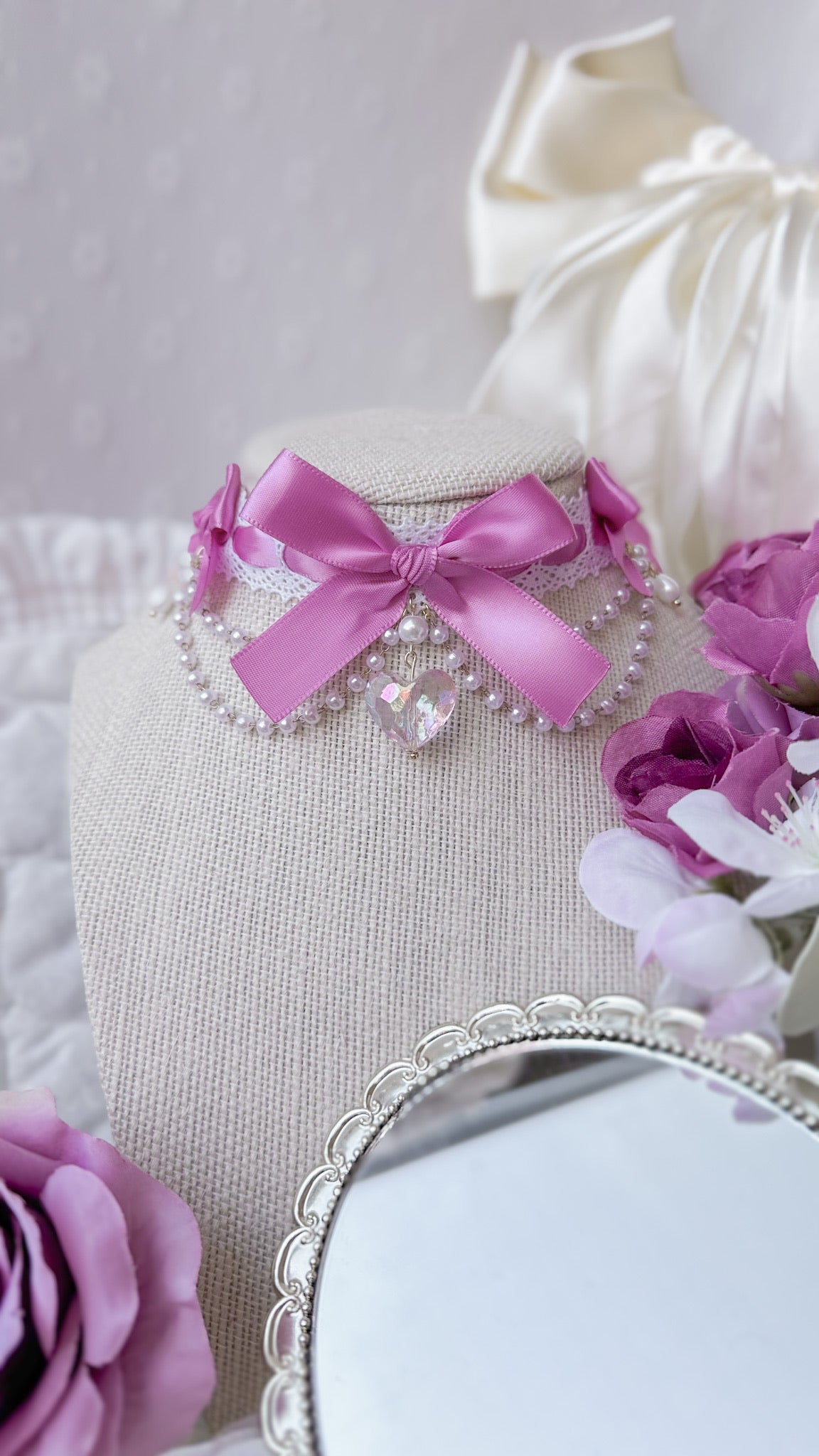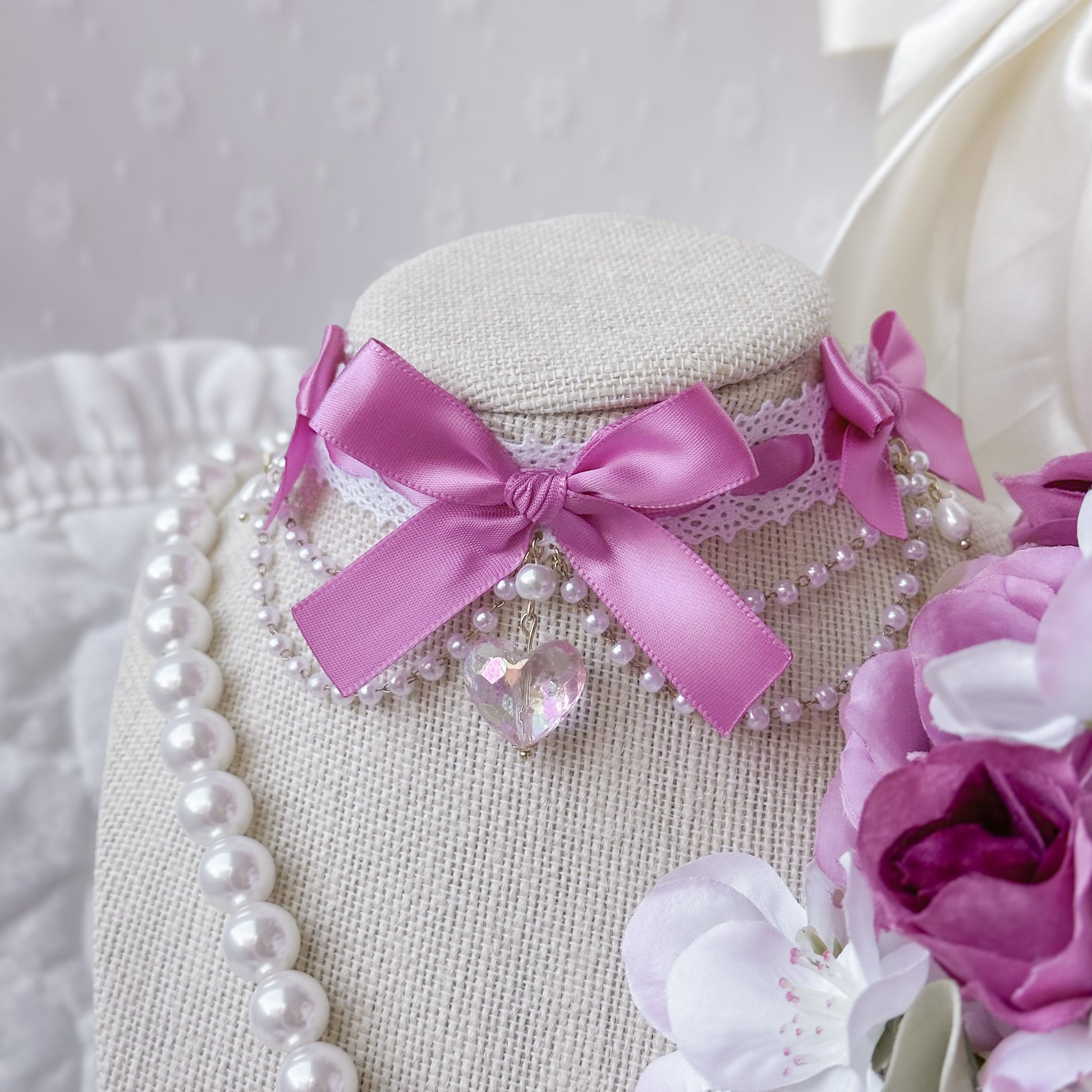 Lace choker with fuchsia pink ribbon and pearl chain.
