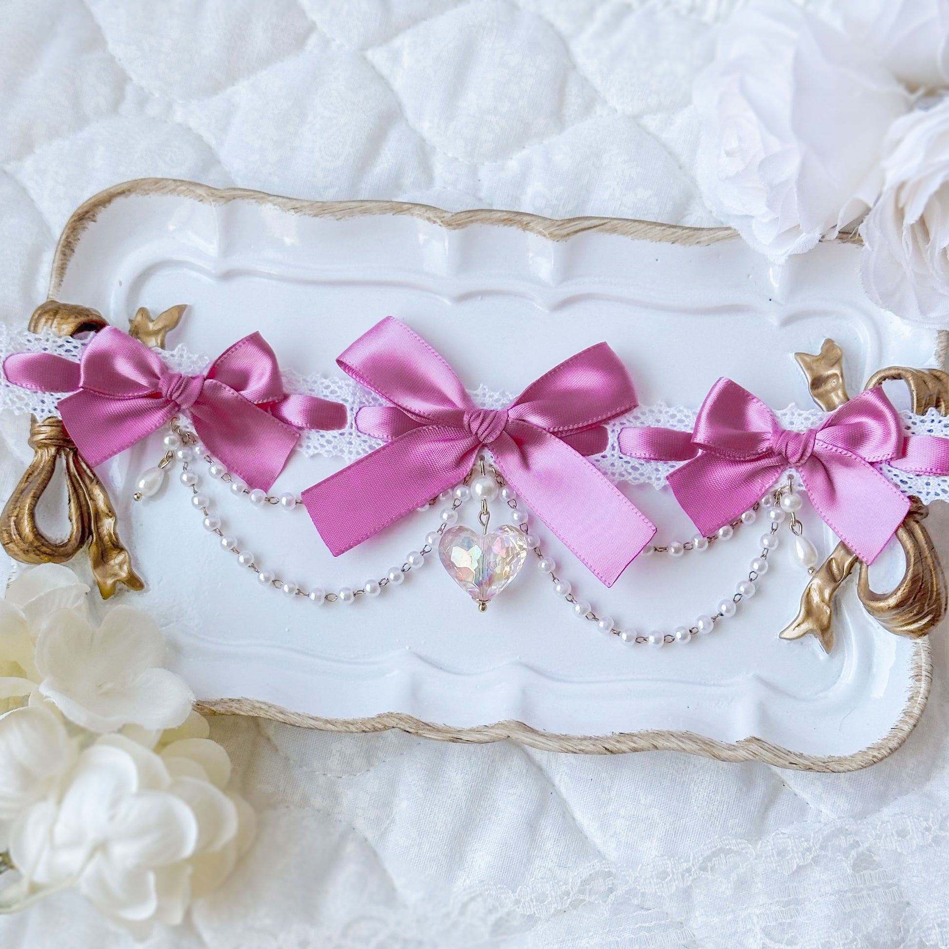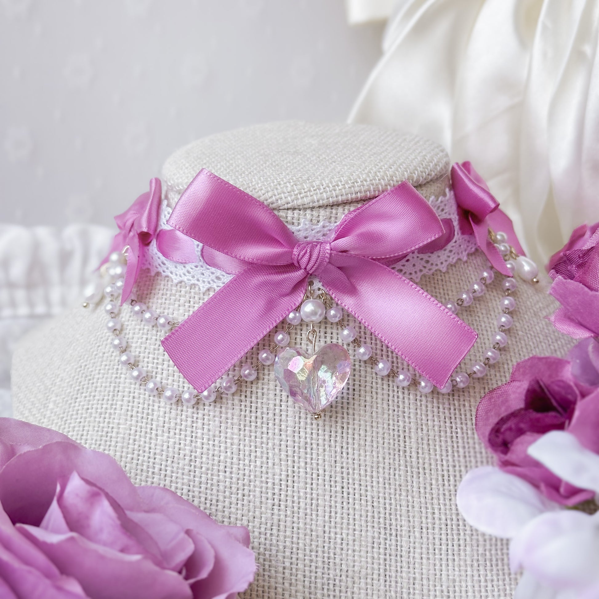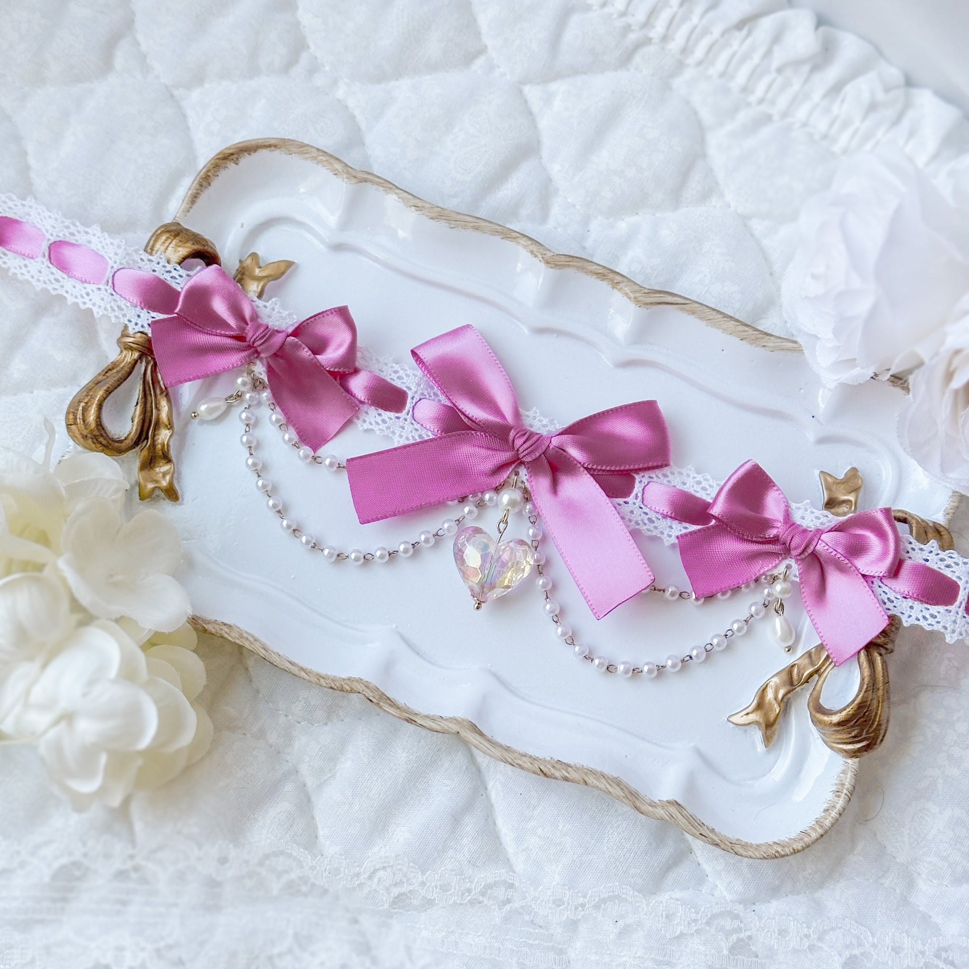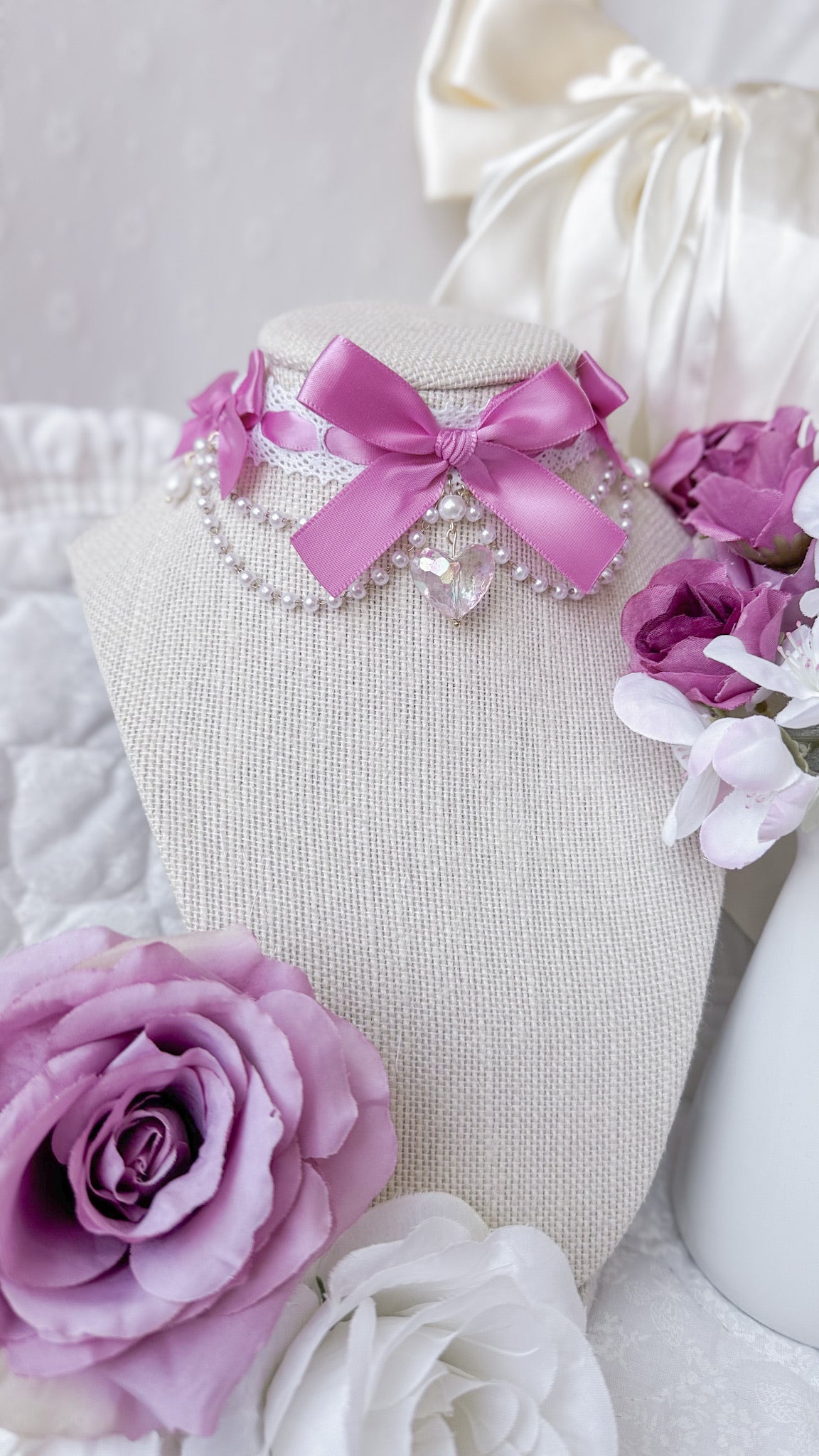 Lace choker with fuchsia pink ribbon and pearl chain.