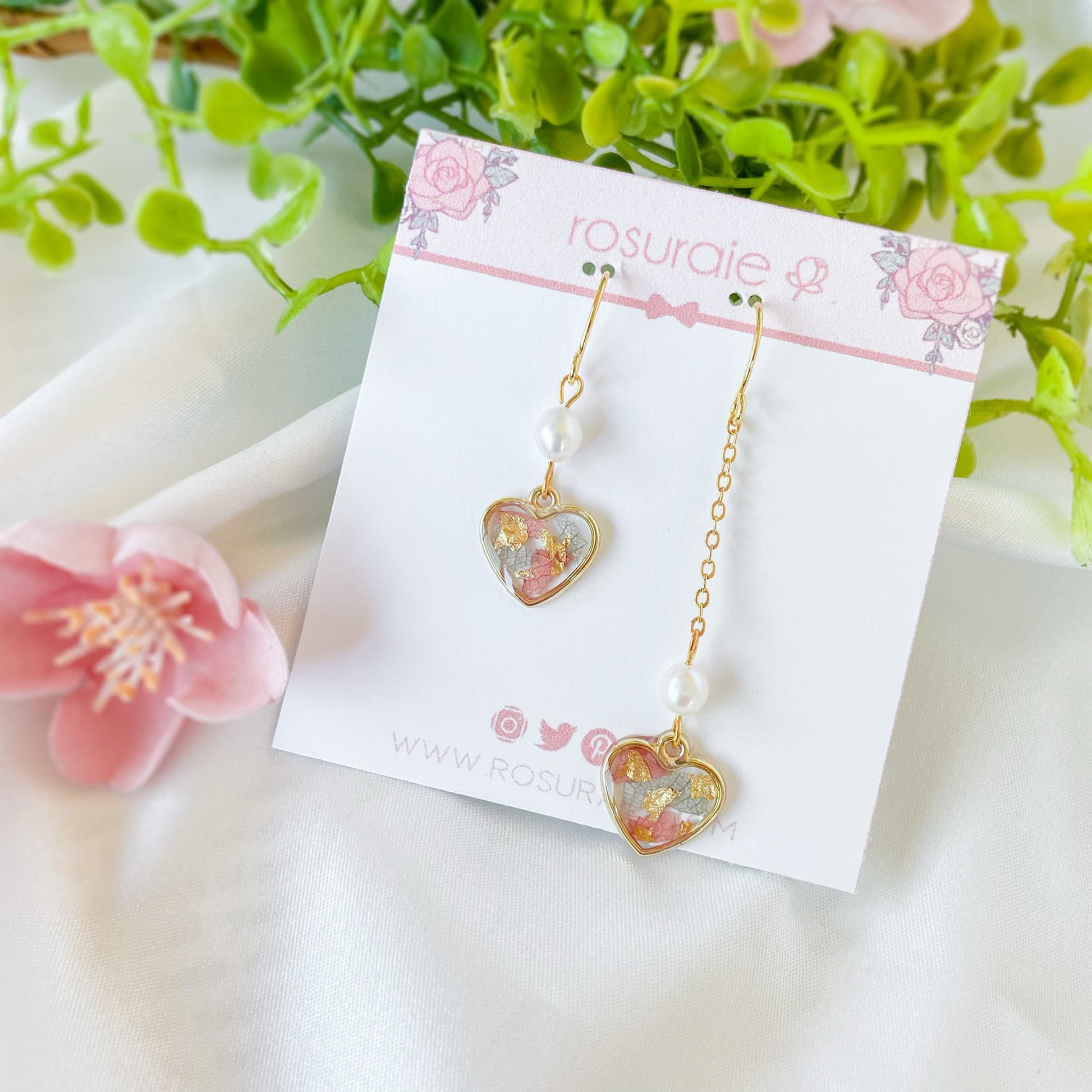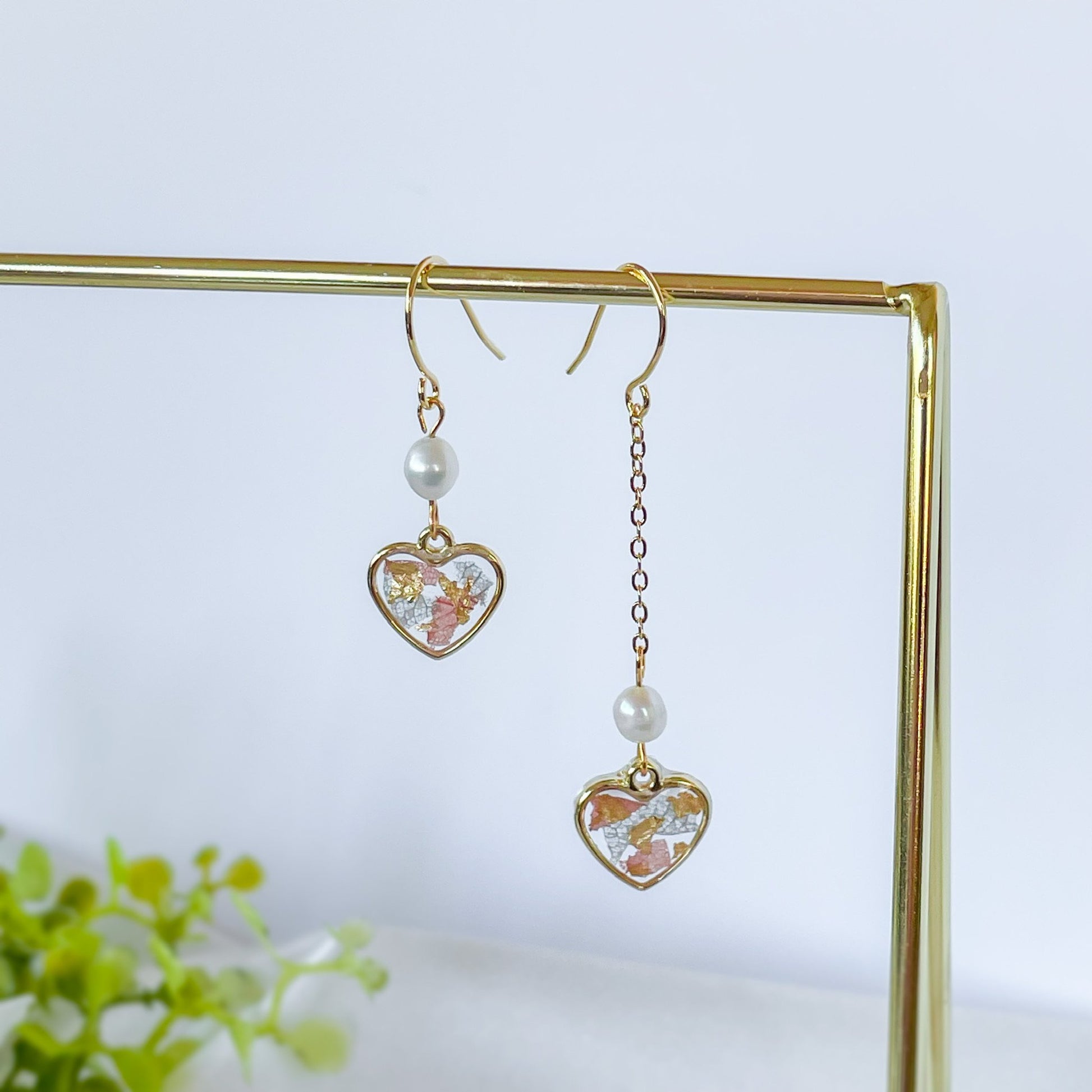 Asymmetrical heart earrings with freshwater pearl.