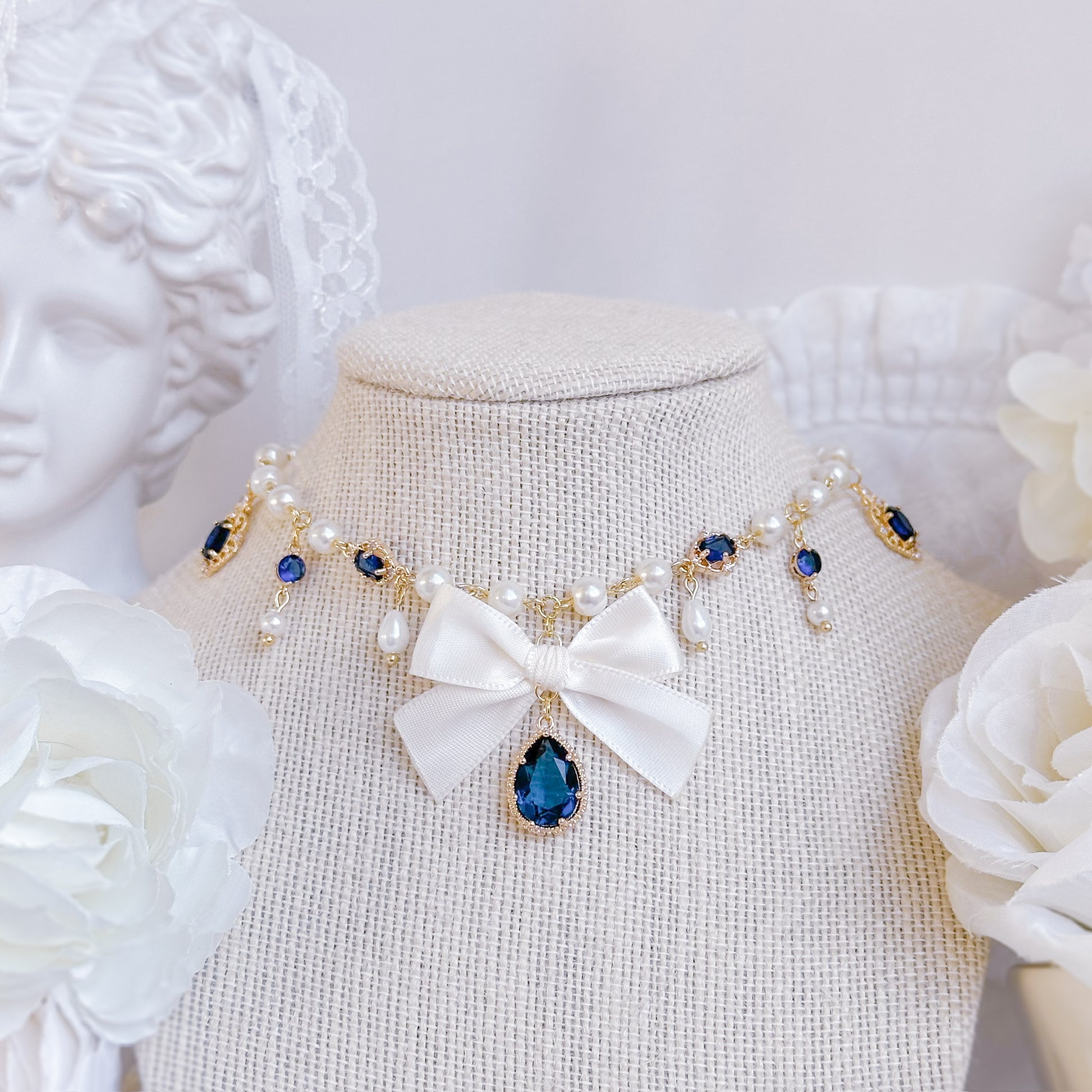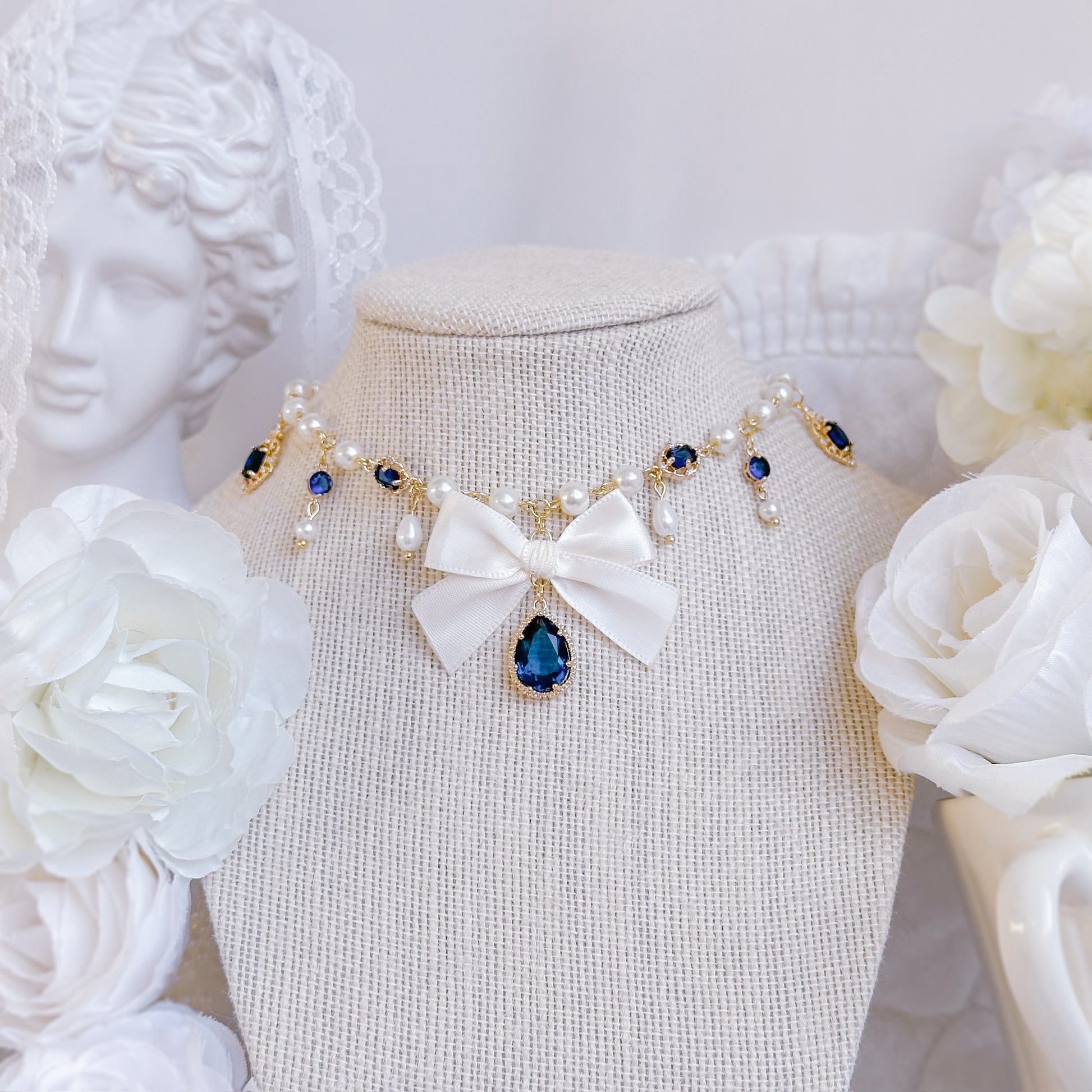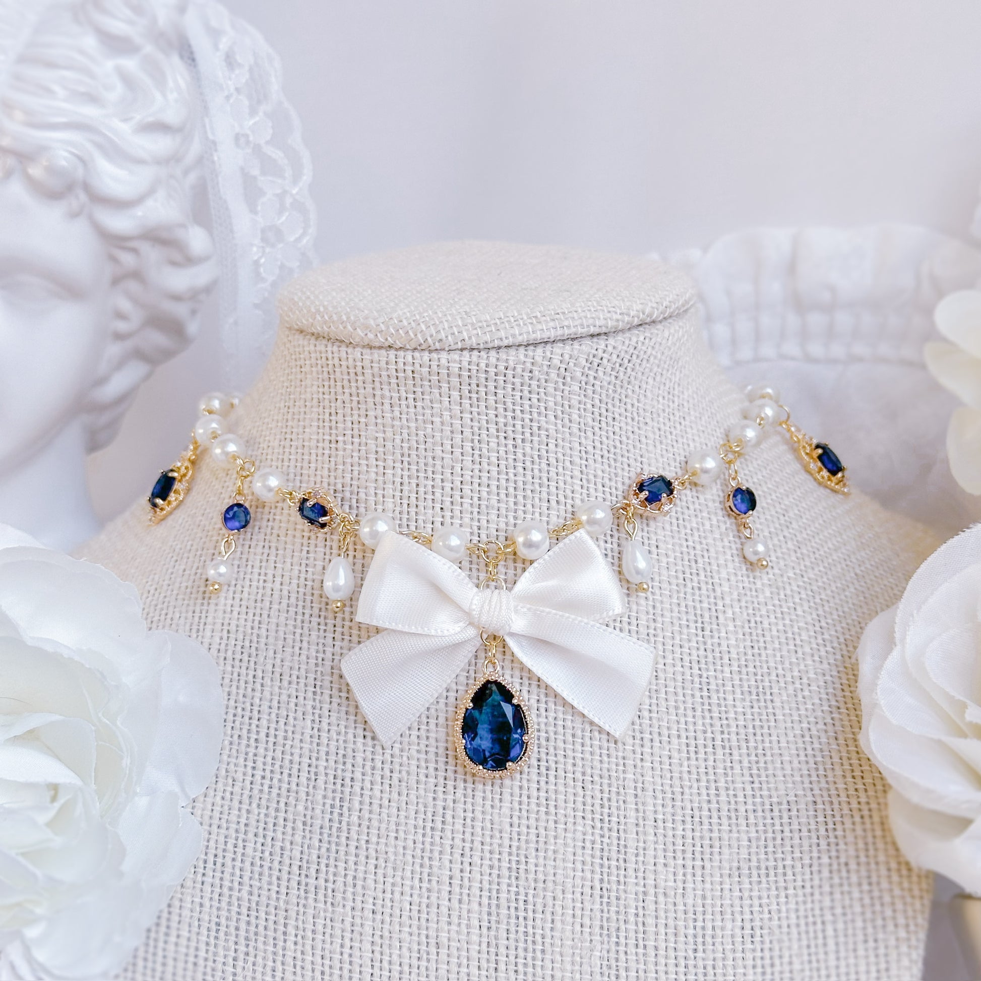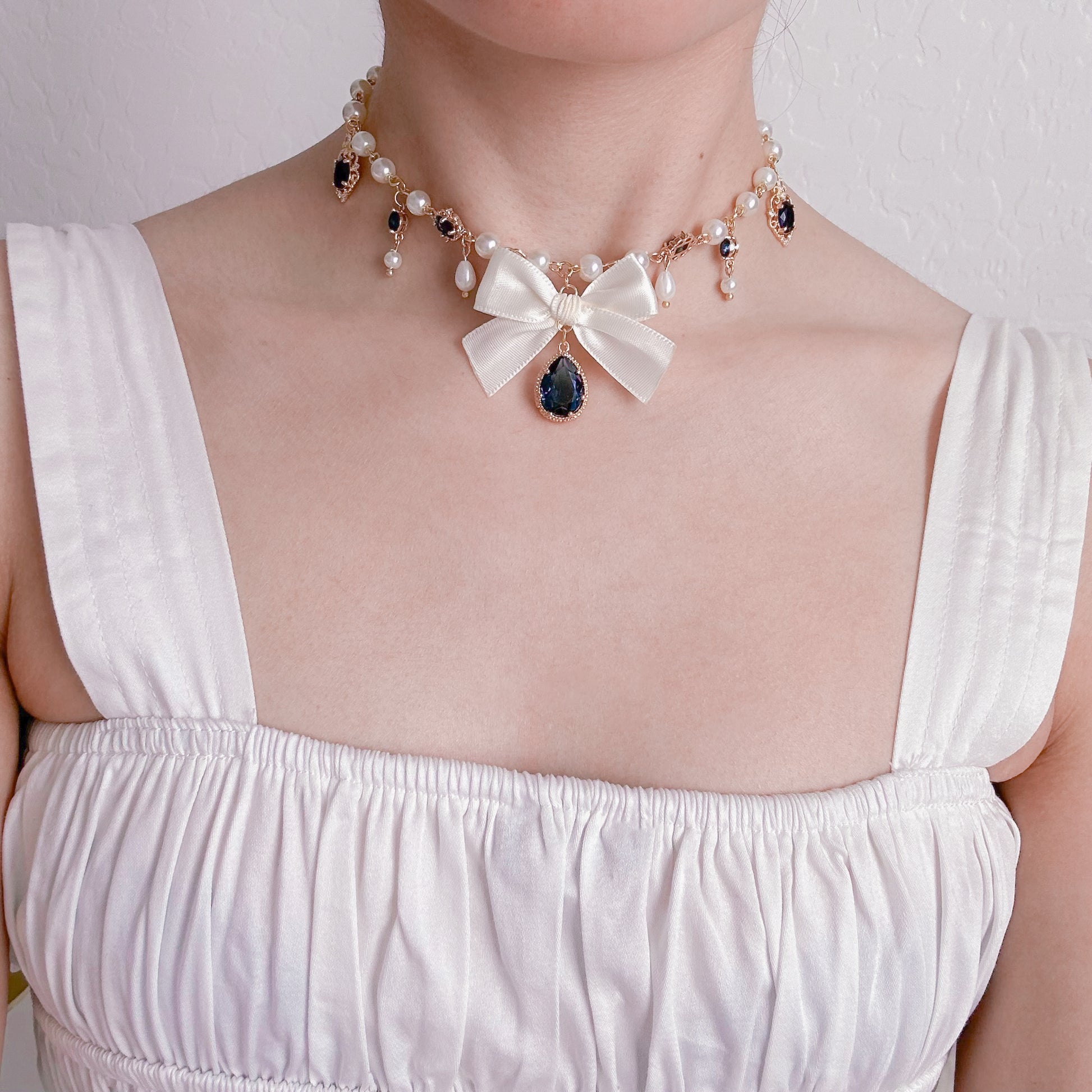 Creme satin bow necklace with navy crystal charms and glass pearls.
