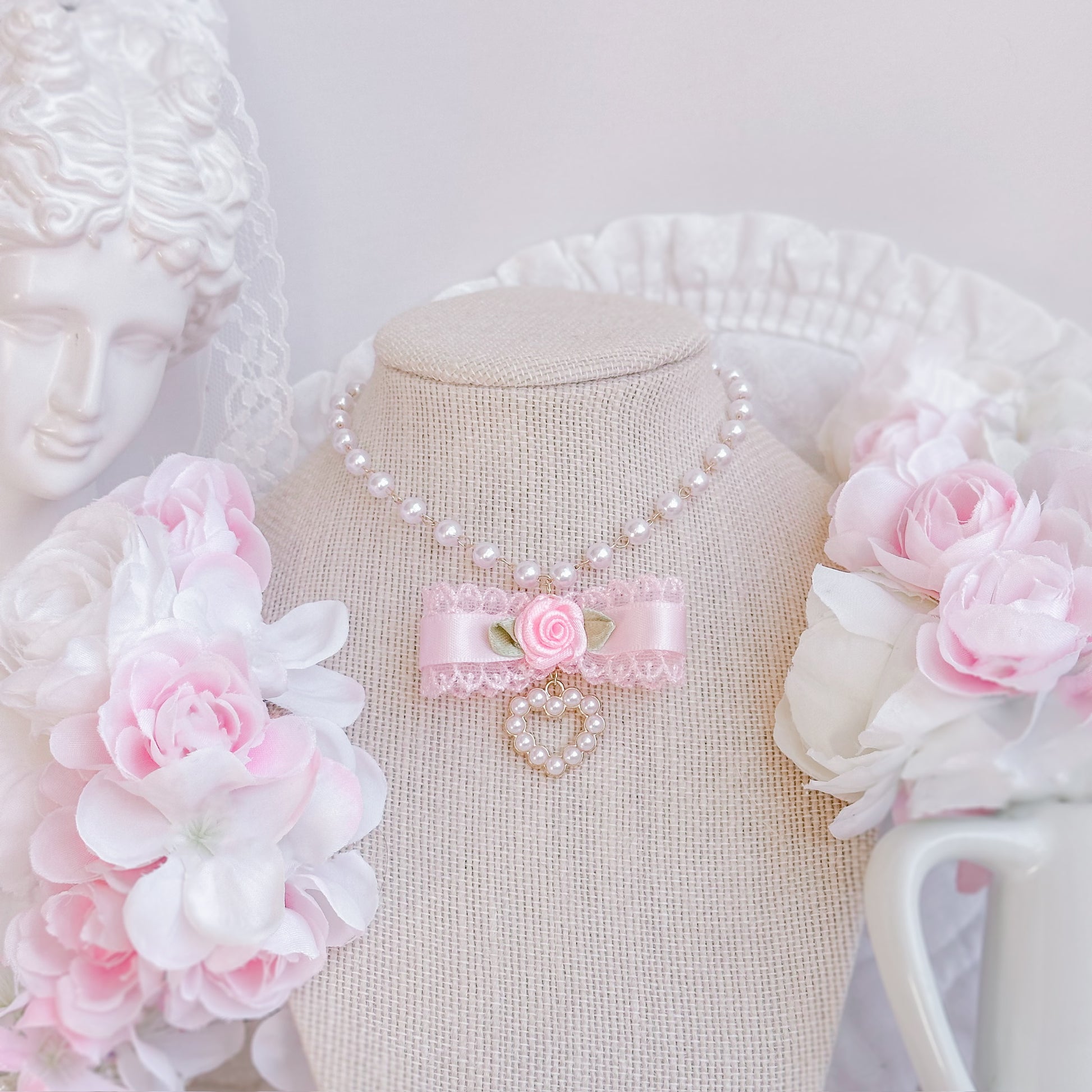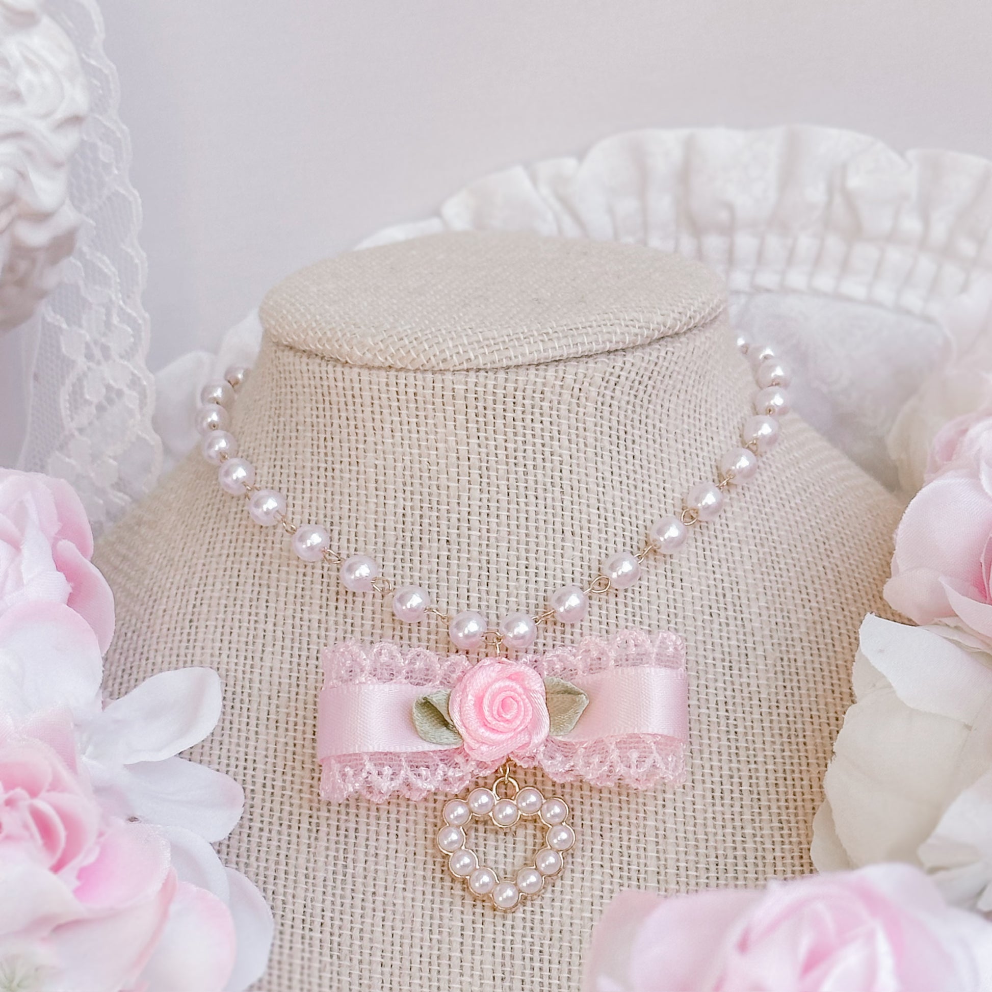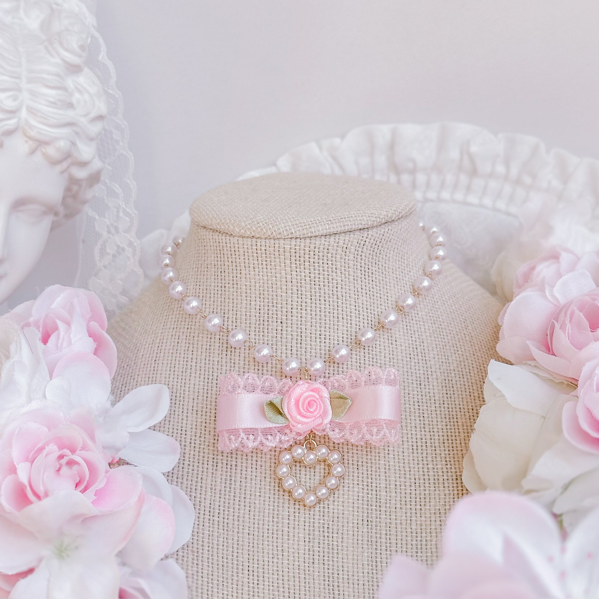 Decorative pearl necklace with pink sheer bow and heart charm.