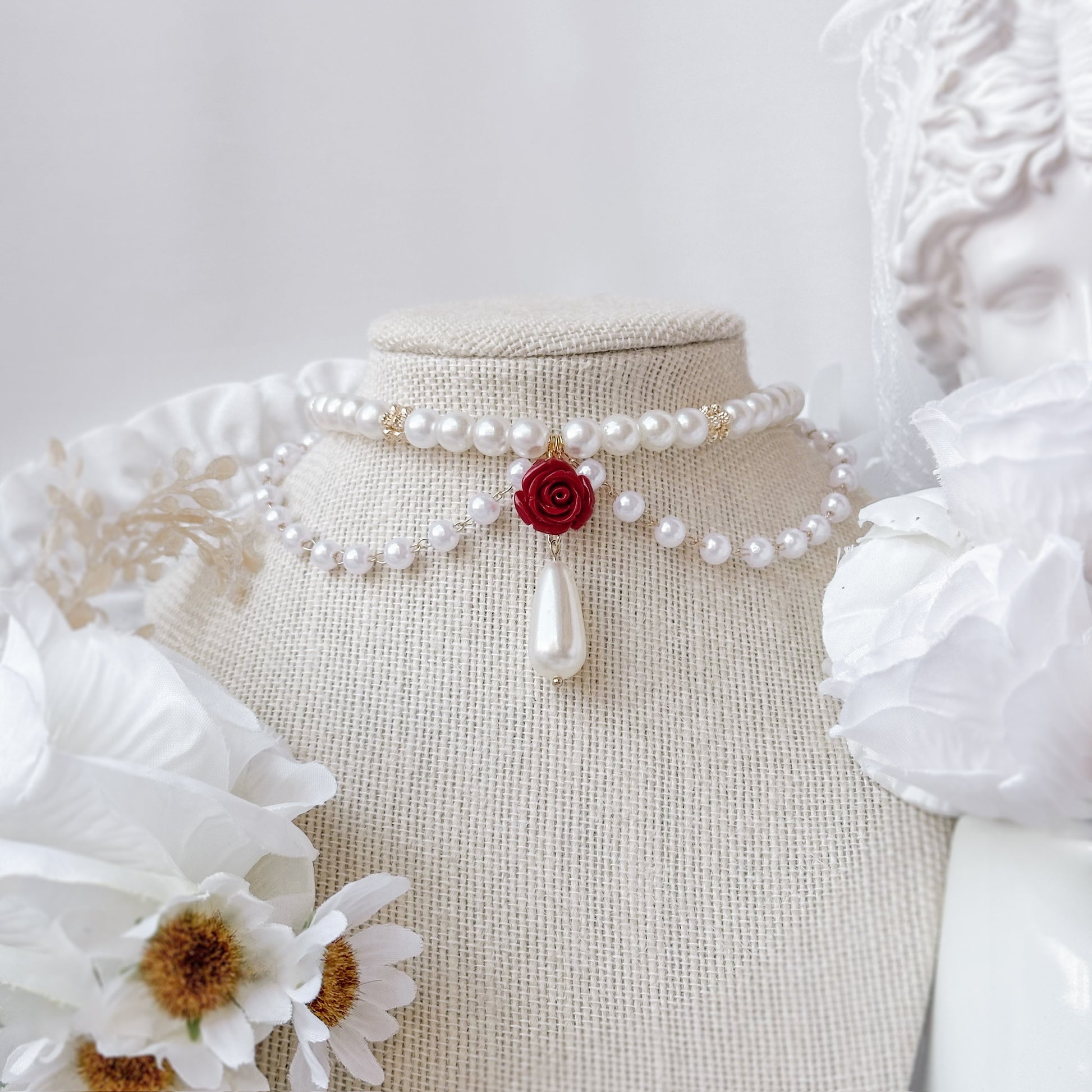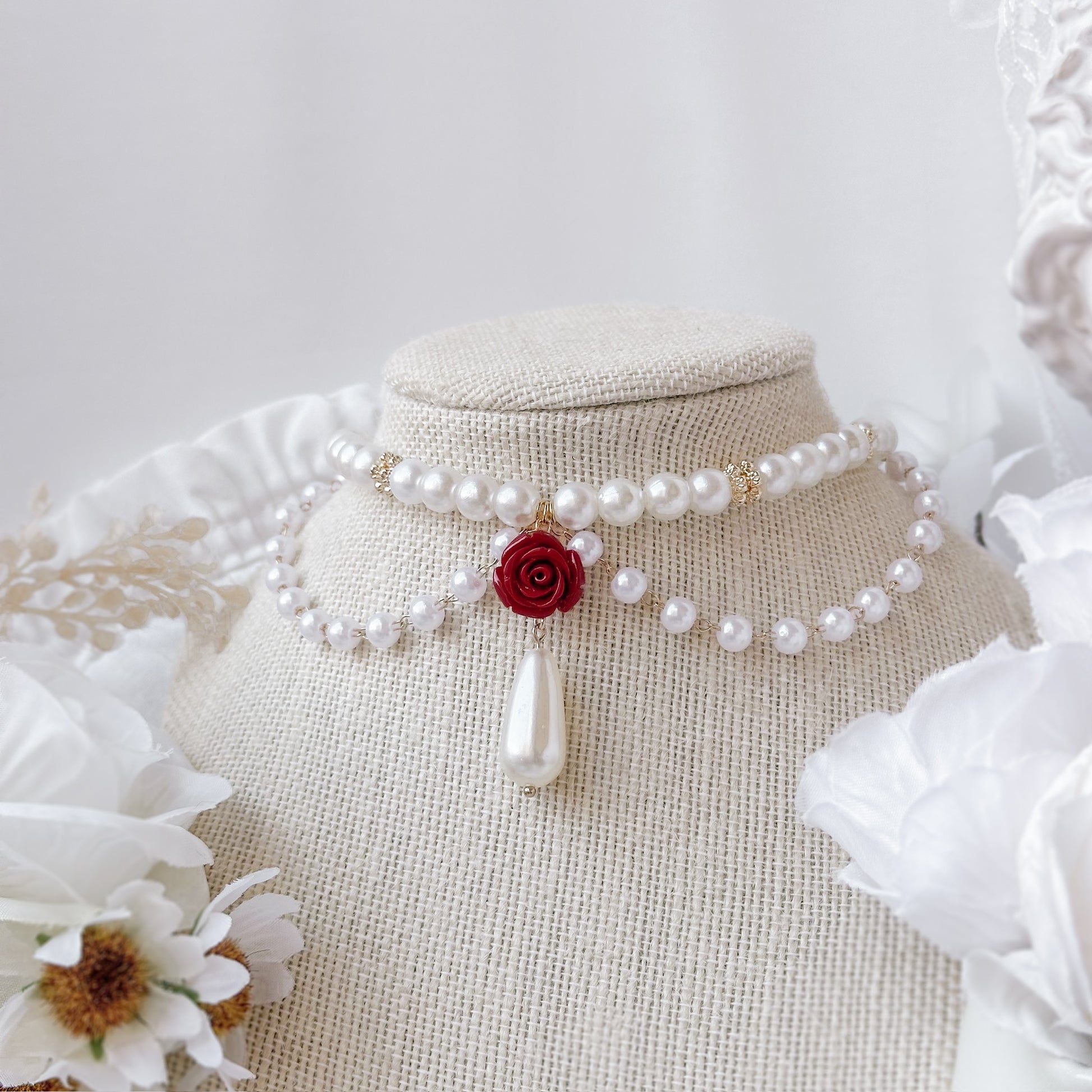 Pearl necklace with red rose pendant.