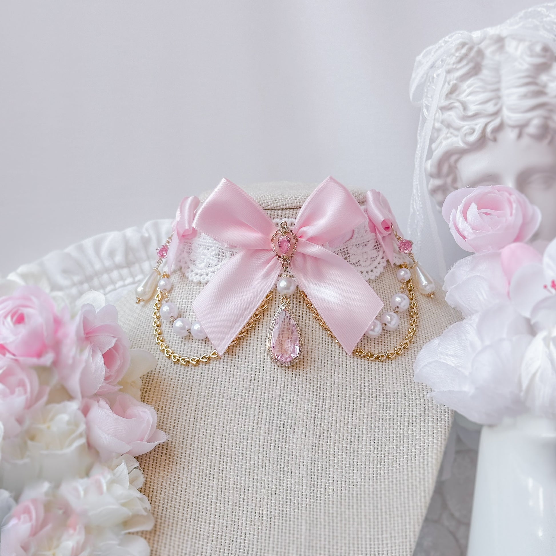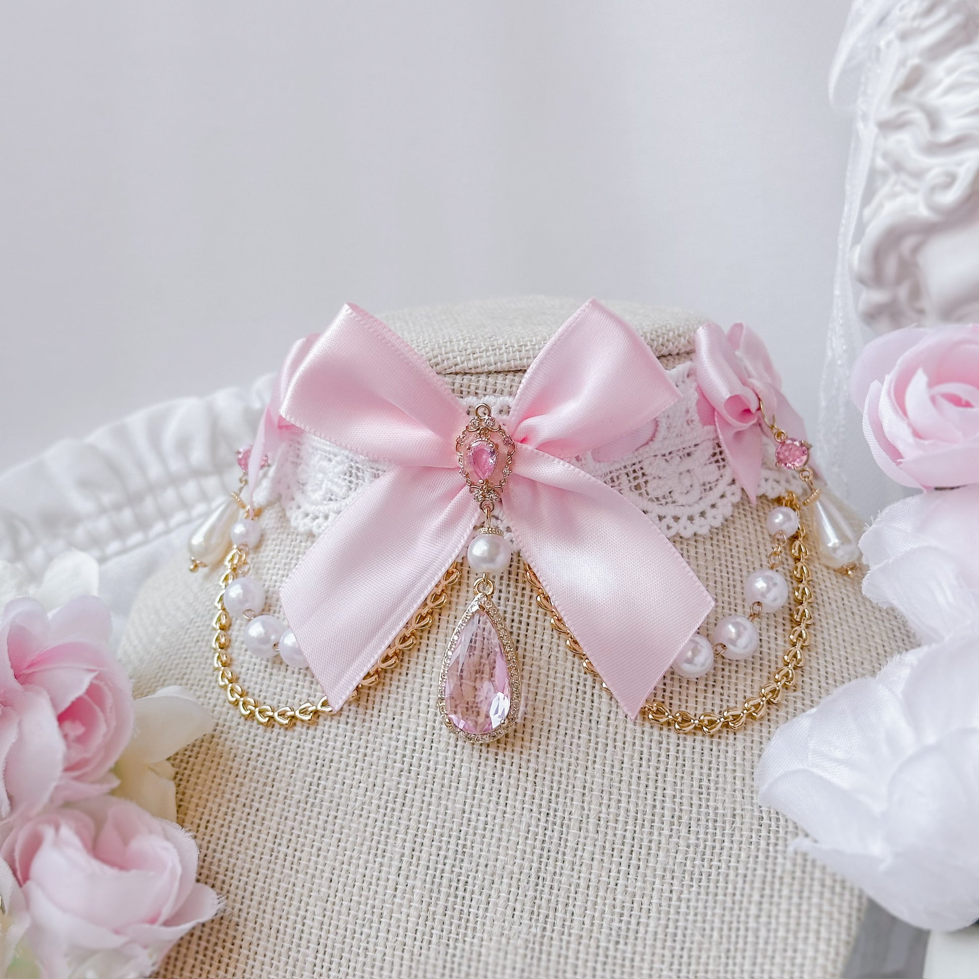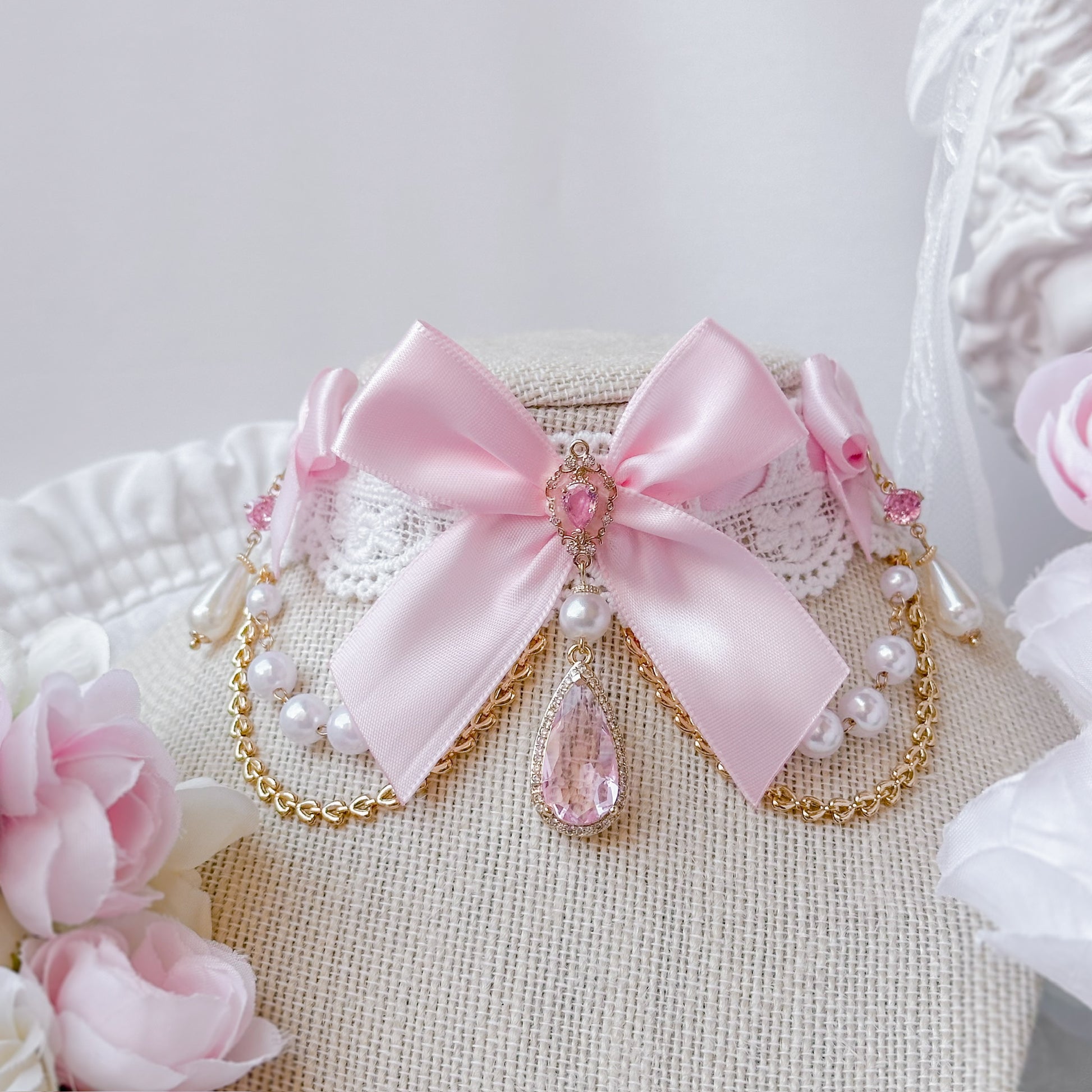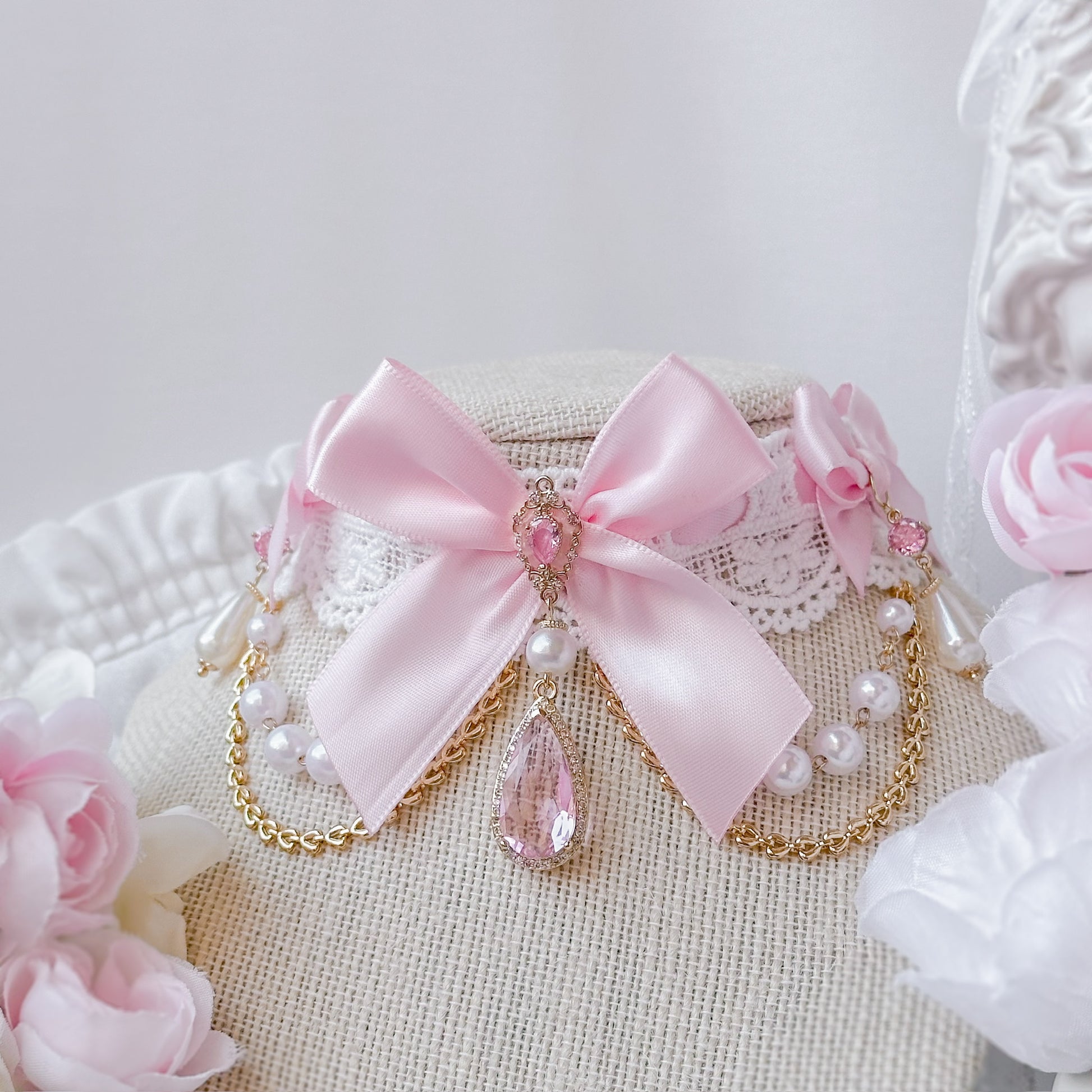 Lace choker with pink satin ribbon and gold accents and glass pearls.