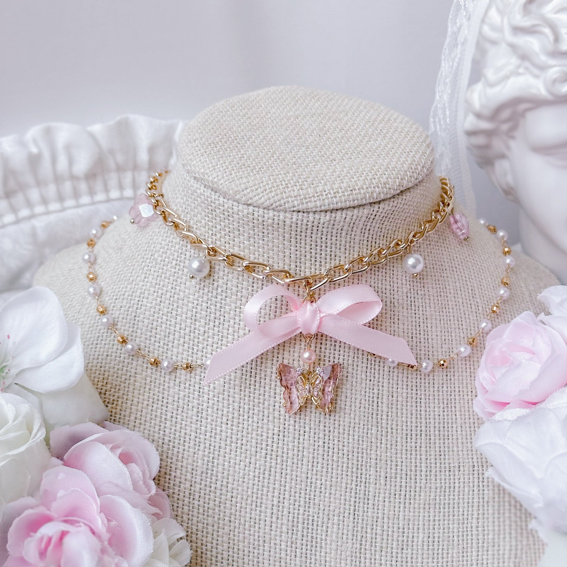 Chain link butterfly necklace with pink satin bow.