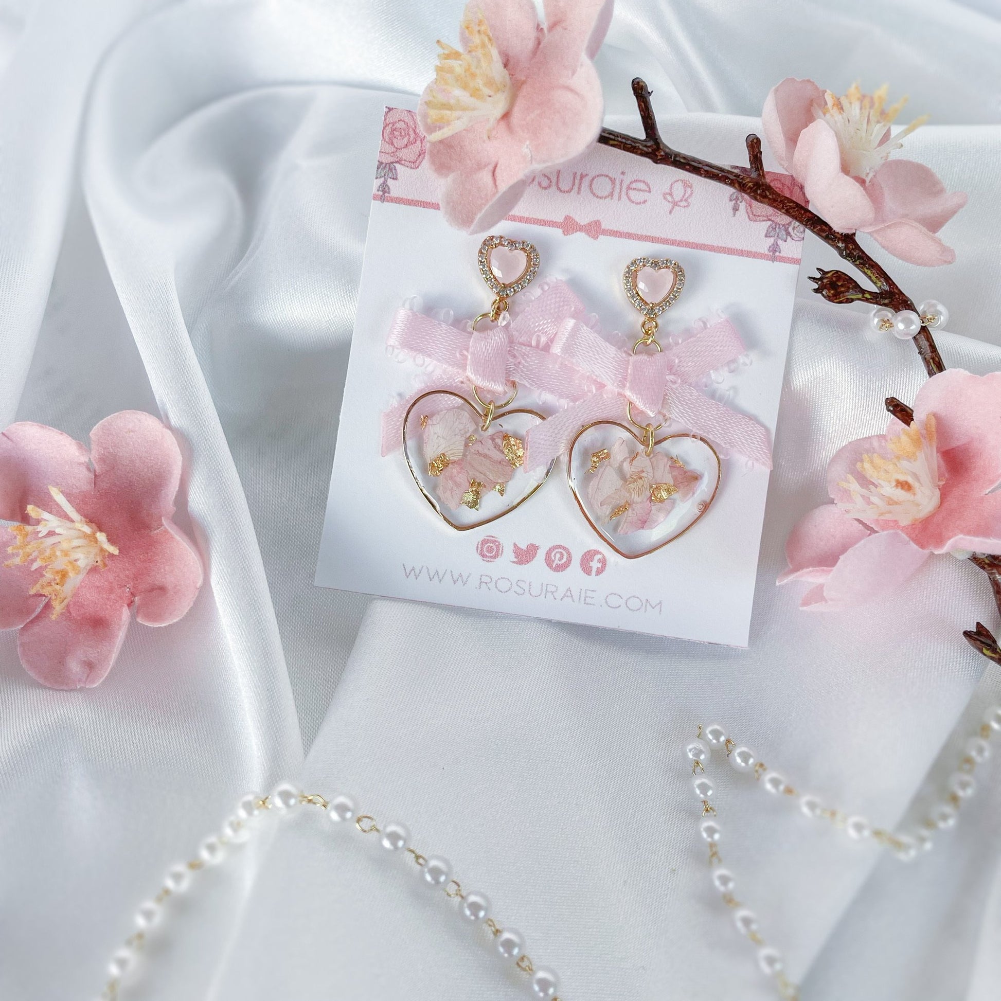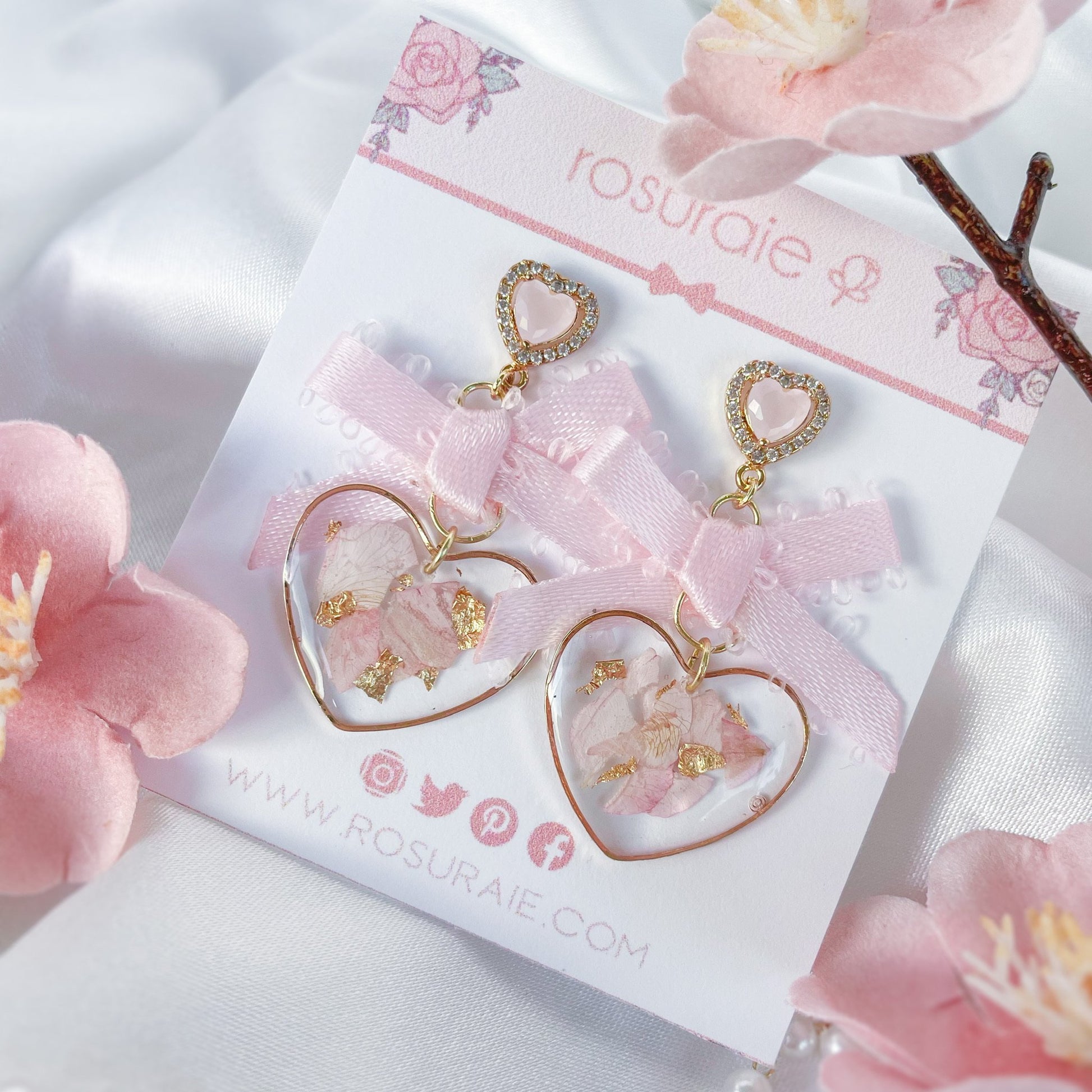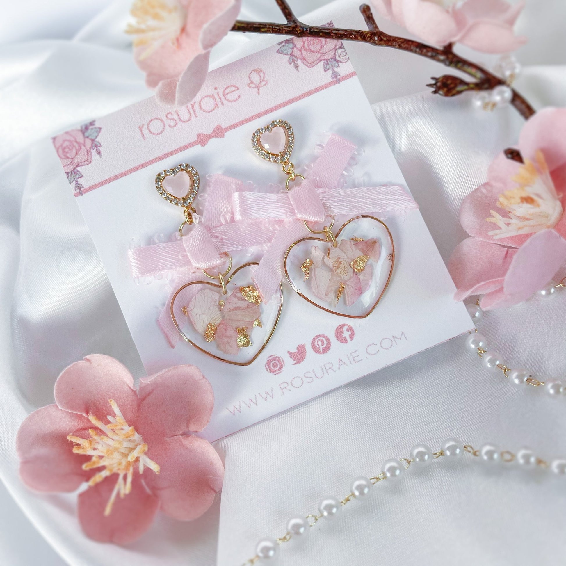 Crystal pink heart earrings with dried flowers and bow.