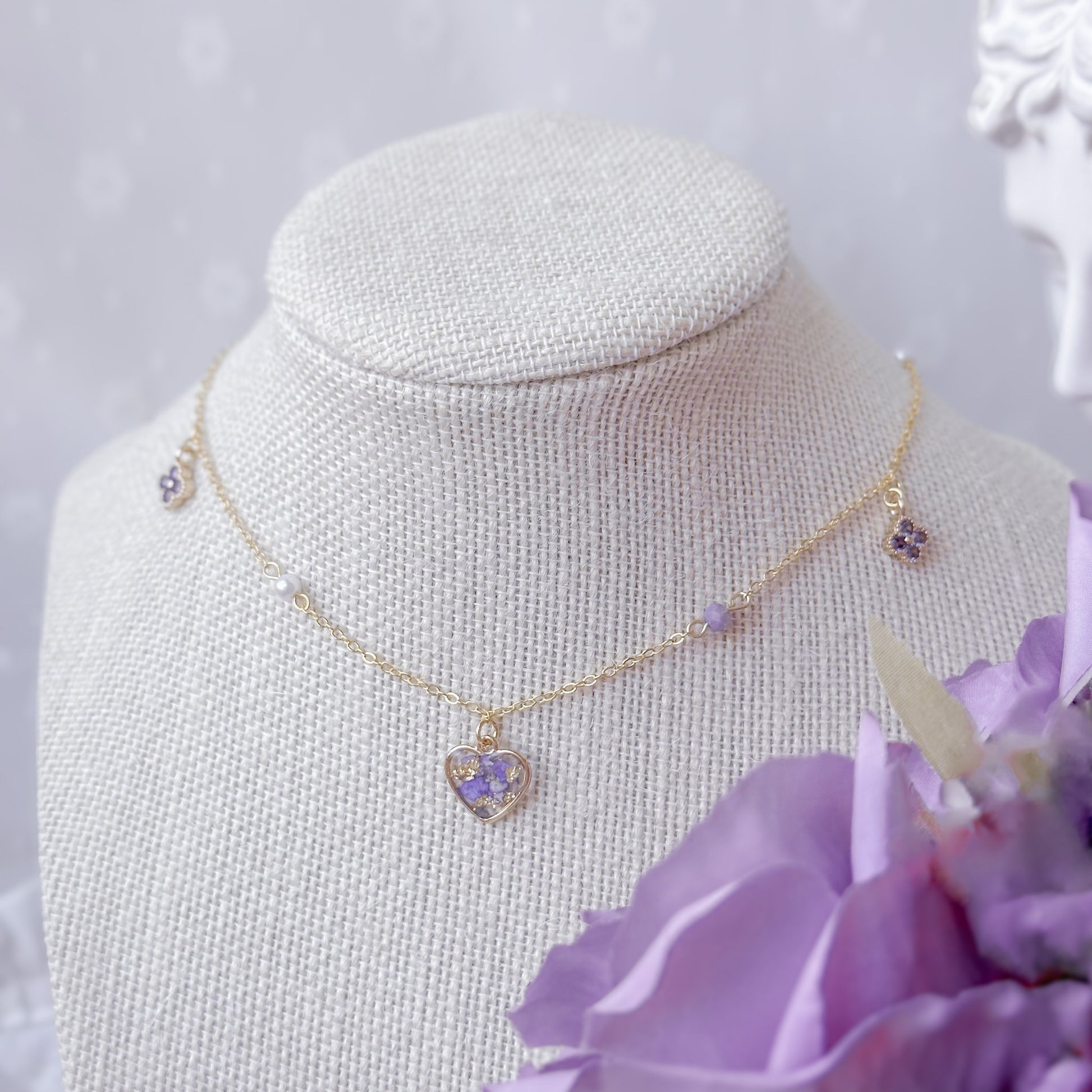 Necklace made with preserved purple flowers and charms.