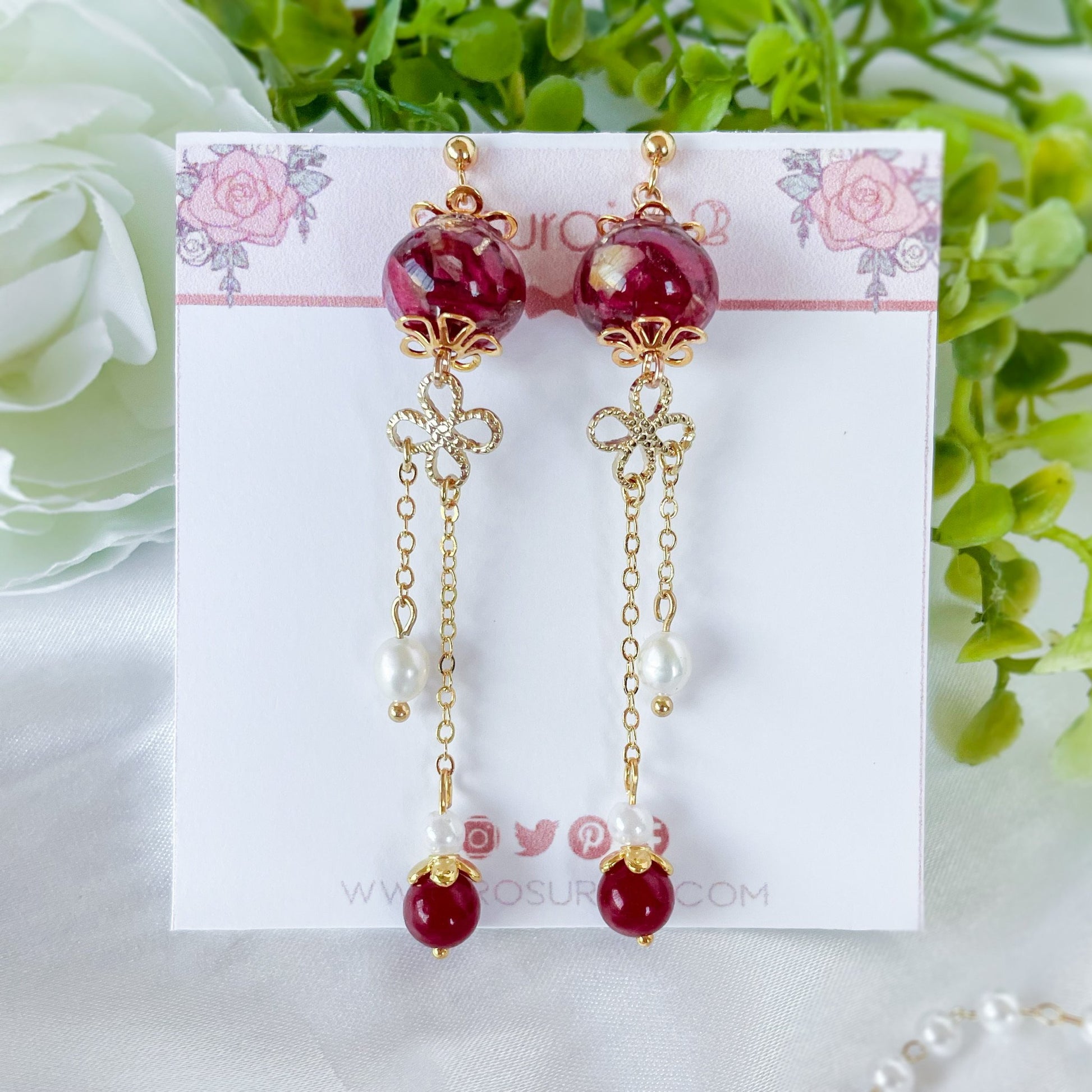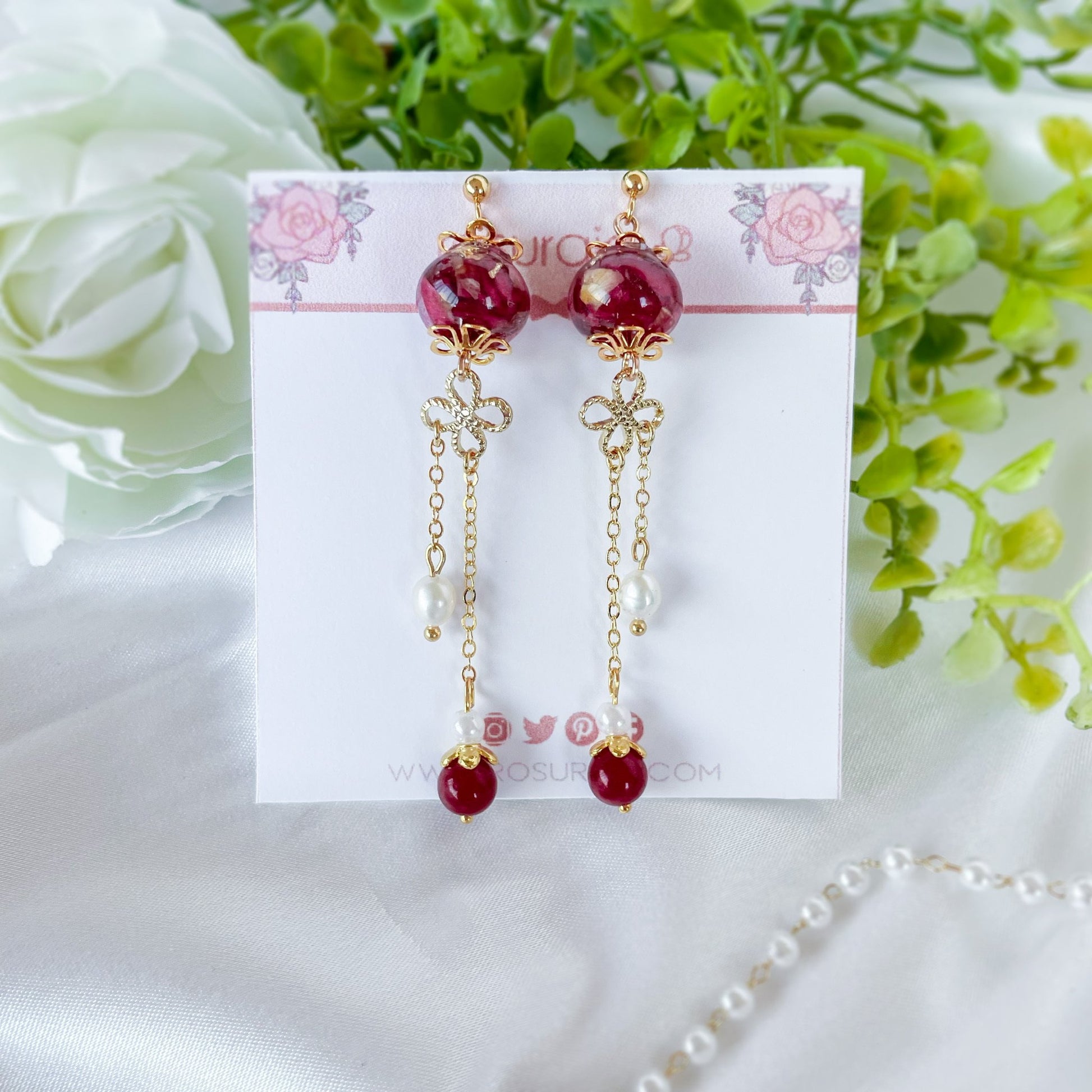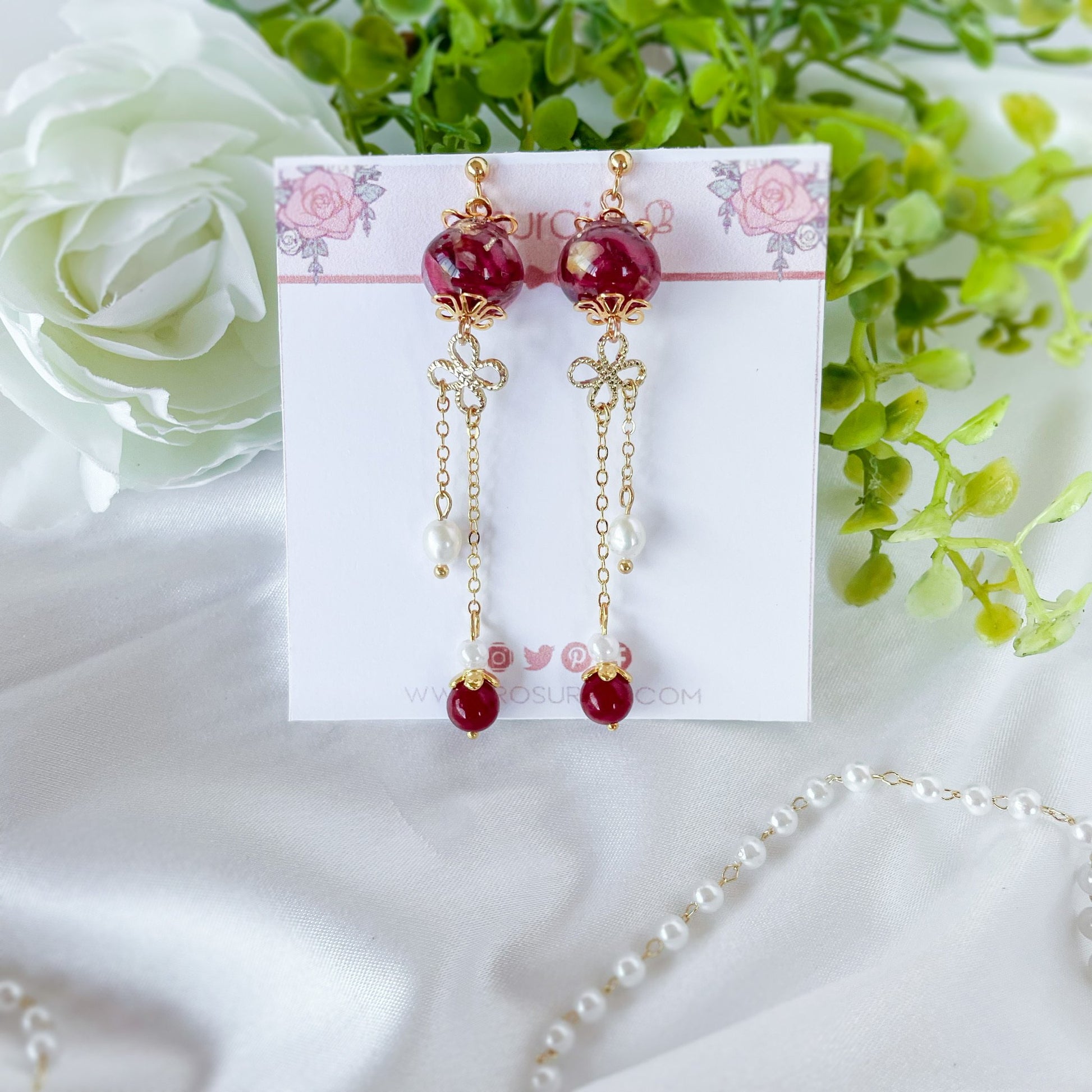 Red bead dangle earrings with dried rose petals and freshwater pearls.