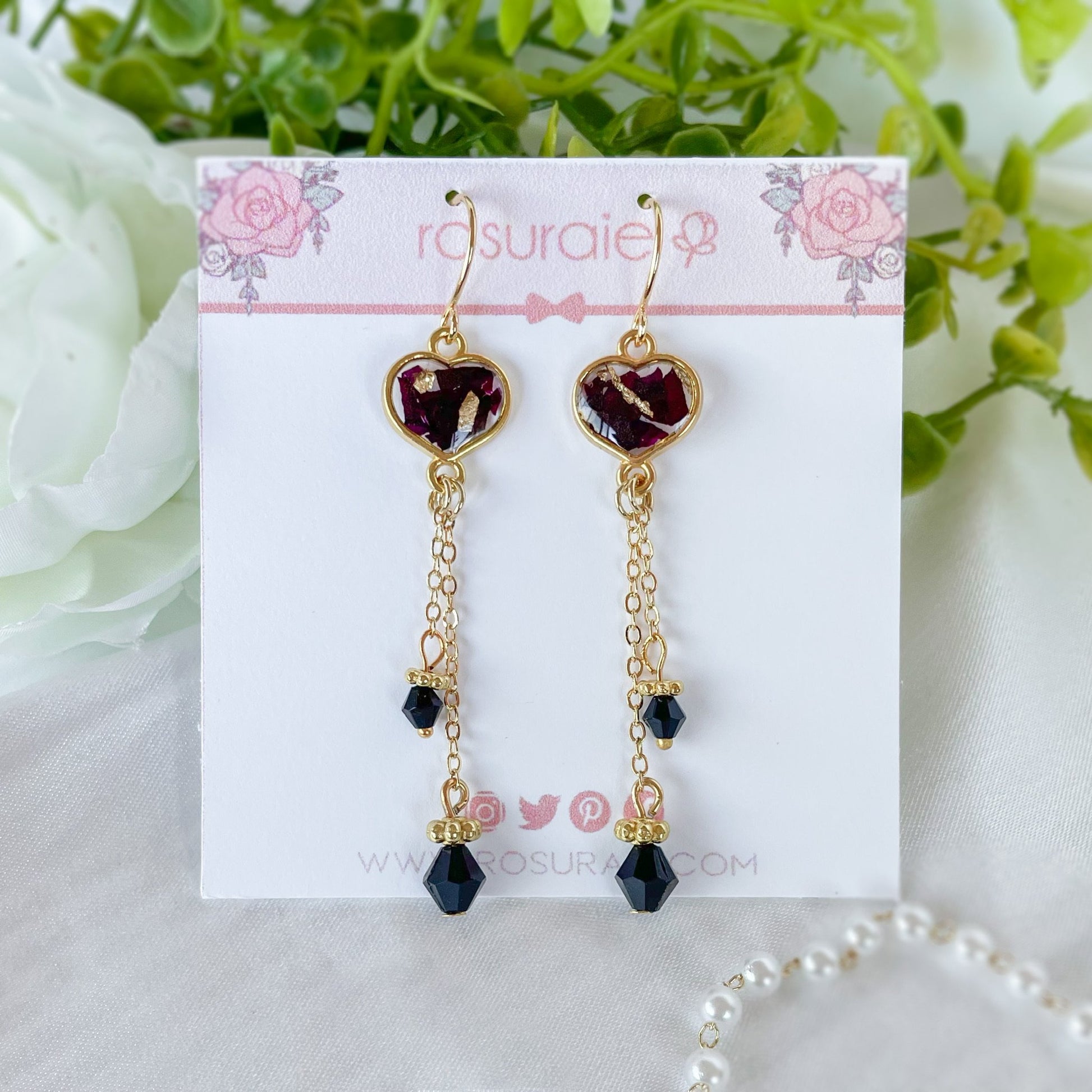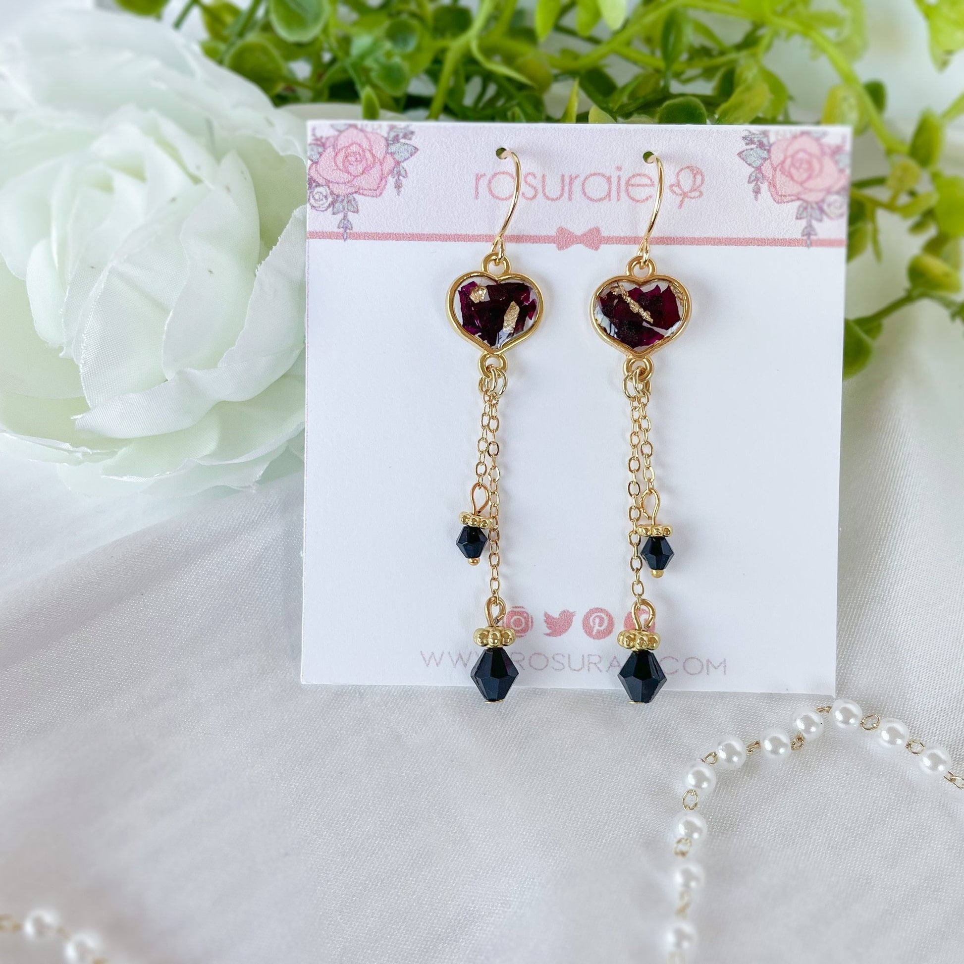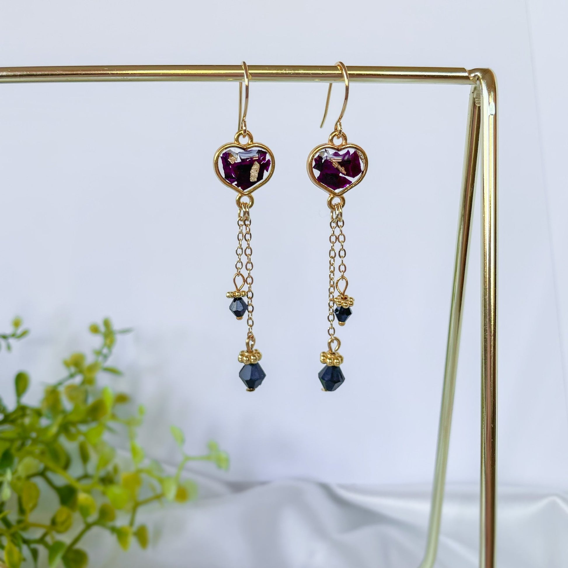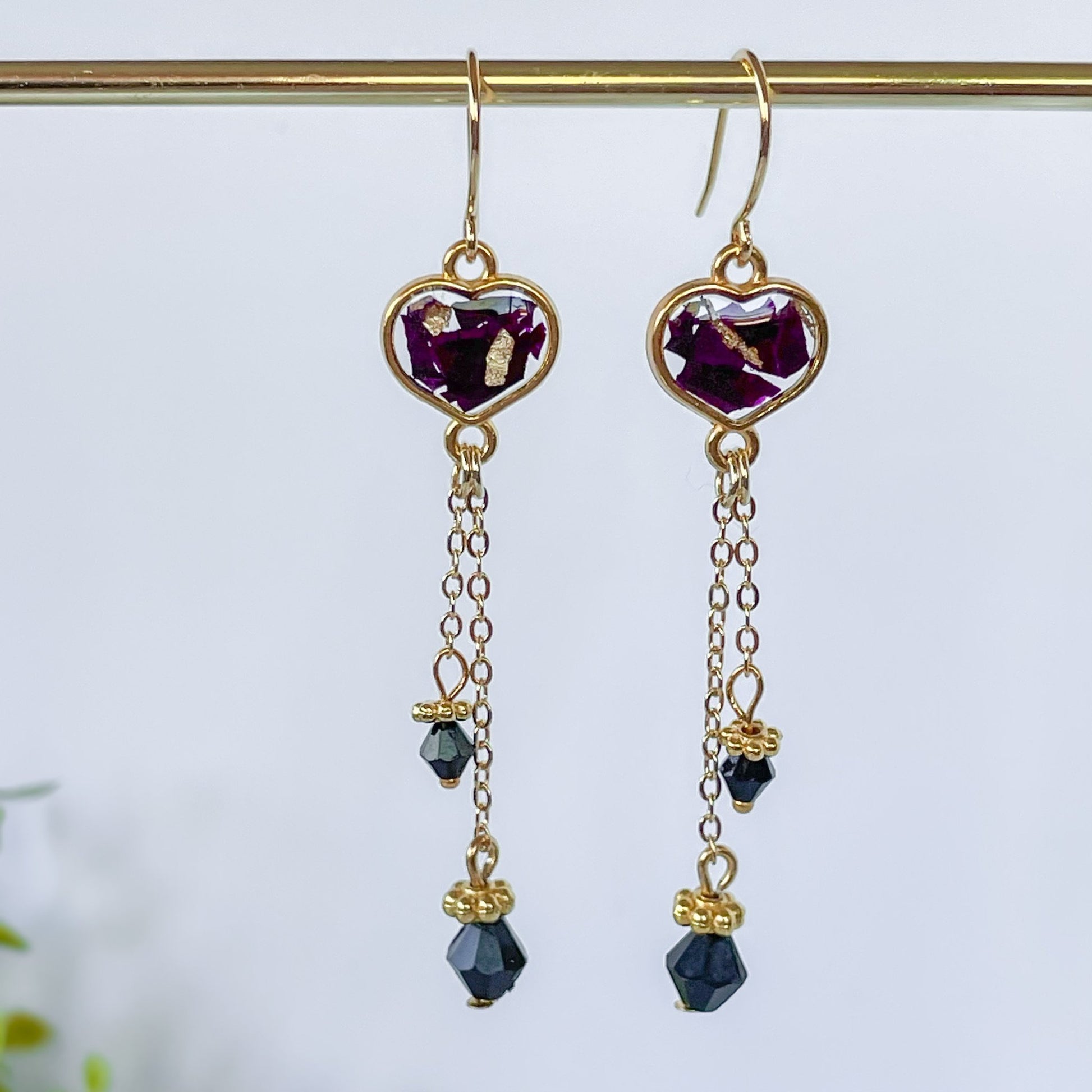 Pendants made with real preserved dark purple flower petals and clear bio-resin.