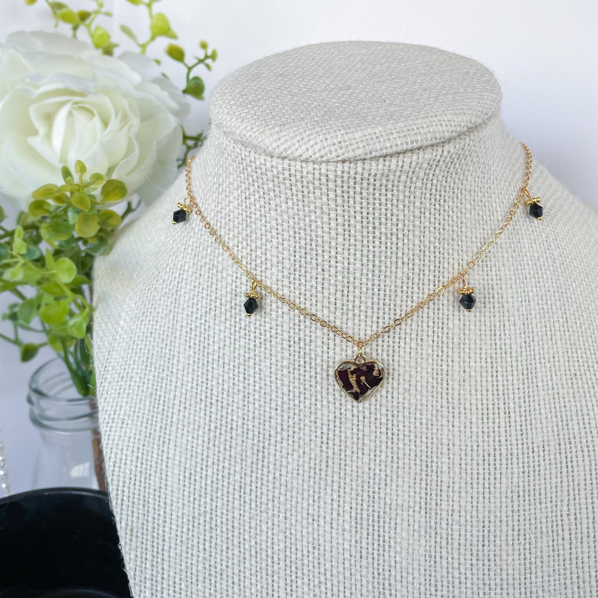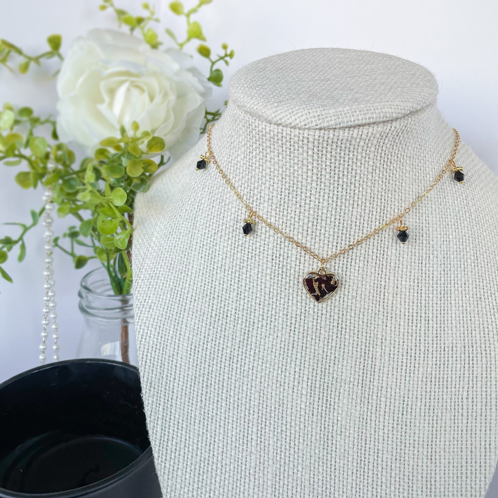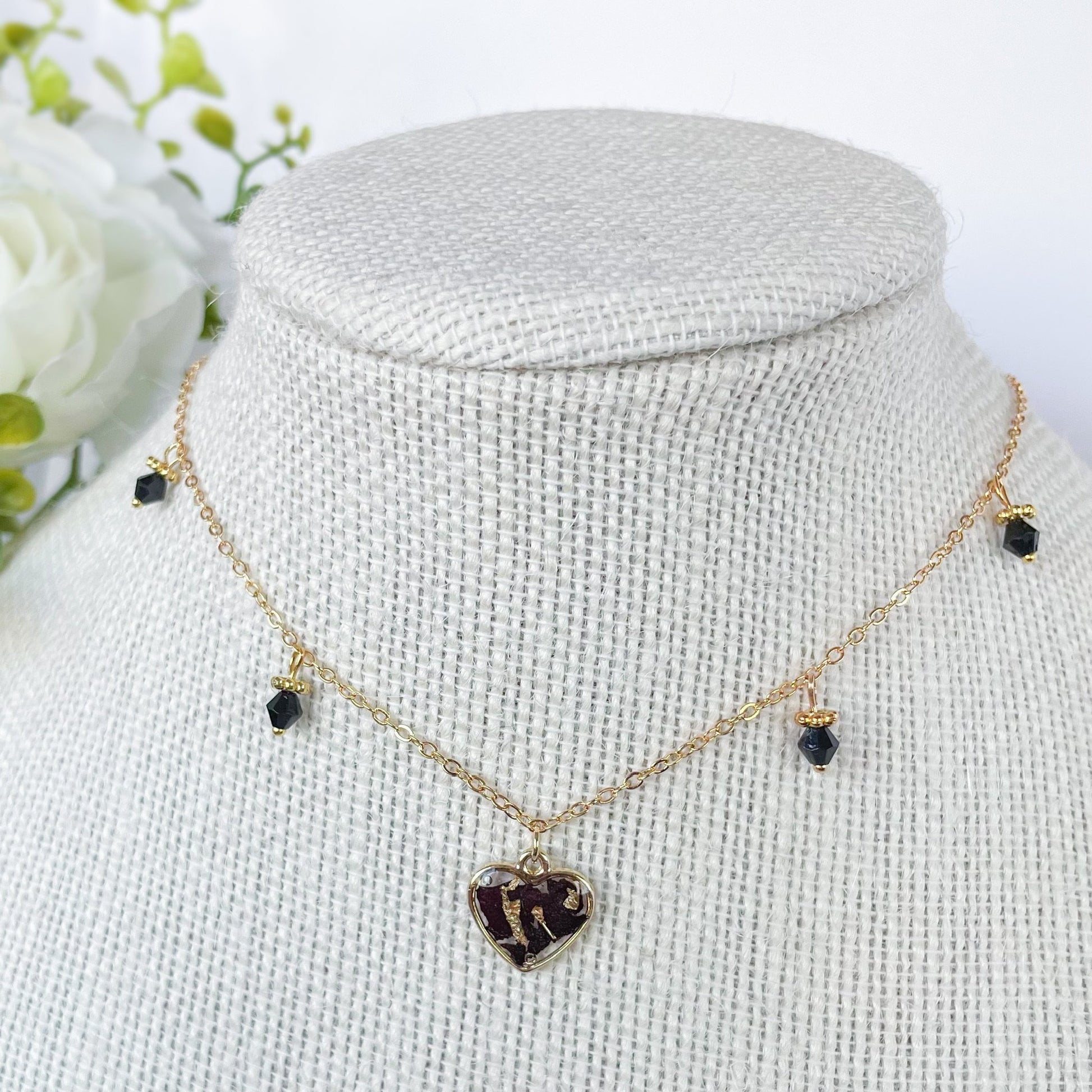 Choker with black glass beads and heart pendant.