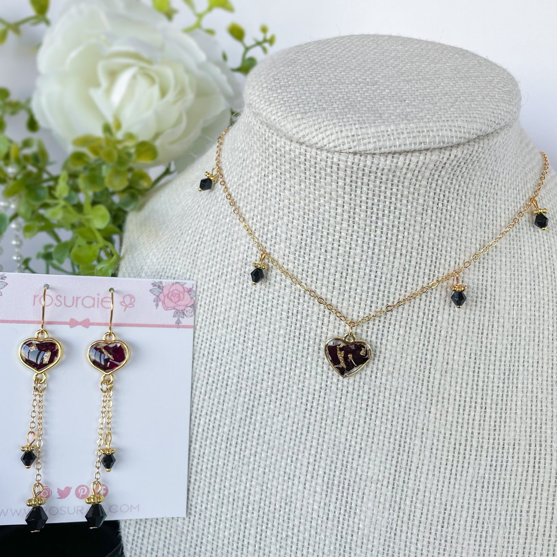 Pendants made with real preserved dark purple flower petals with clear bio-resin.