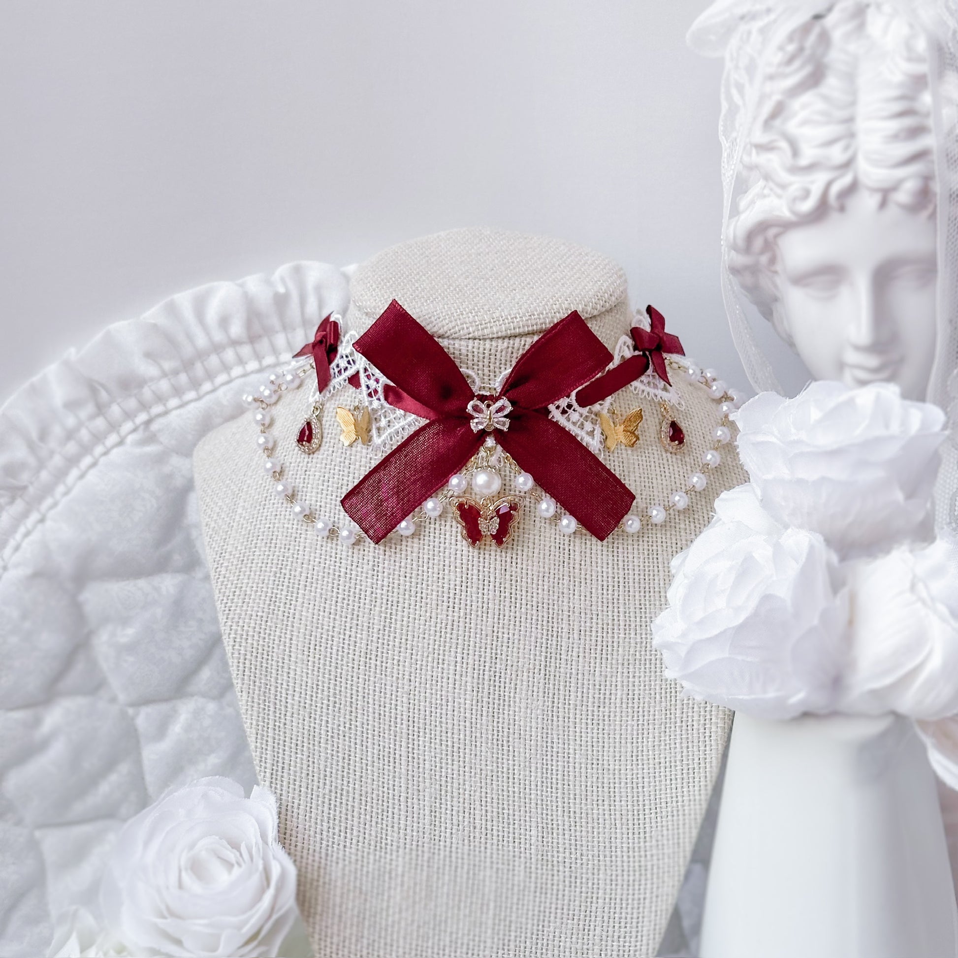 Lace choker with red satin ribbon and crystal butterfly accents.