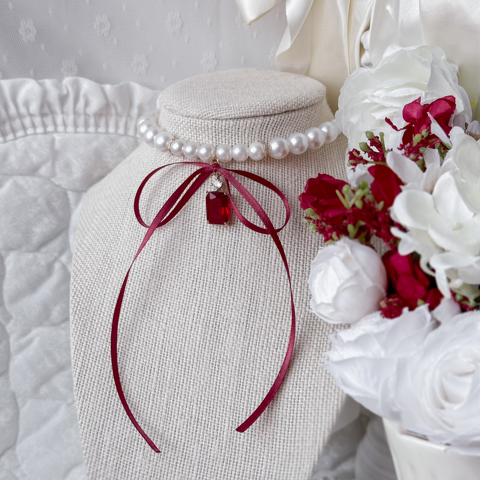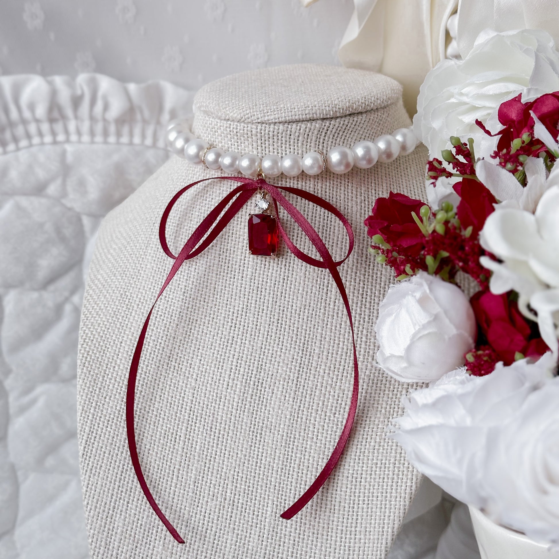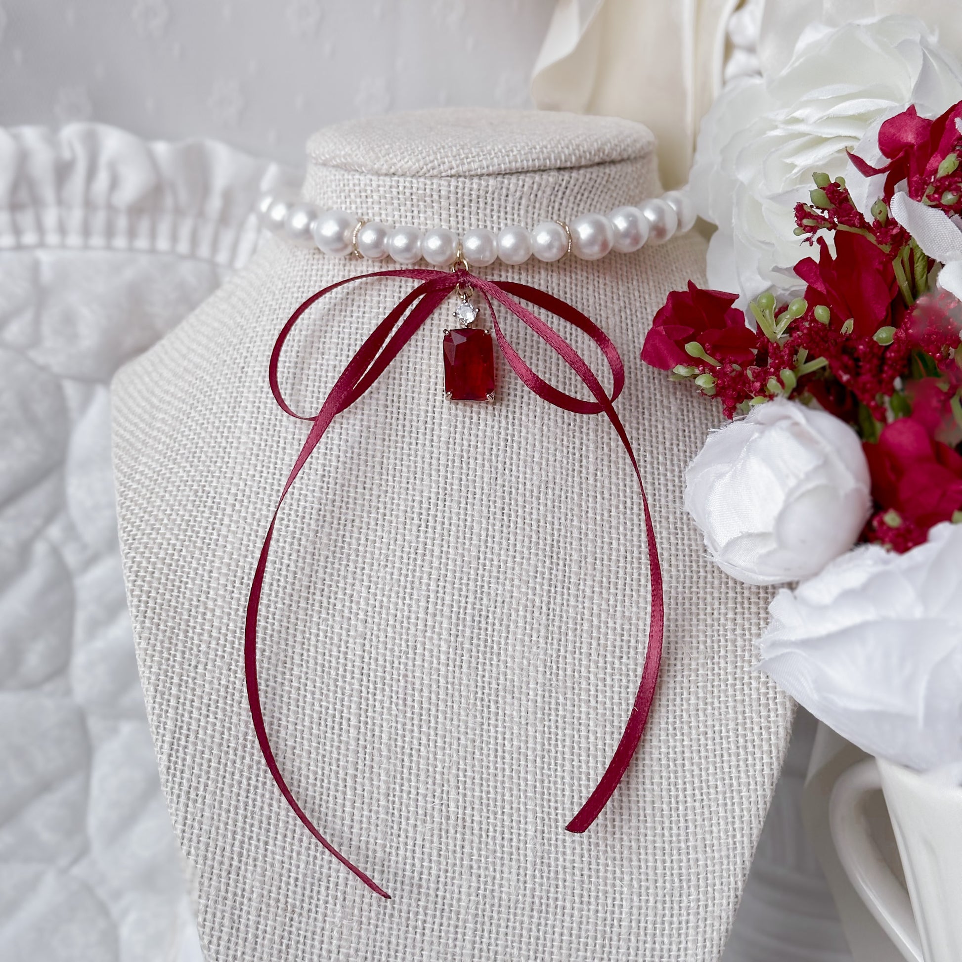 Pearl necklace with red crystal charms.
