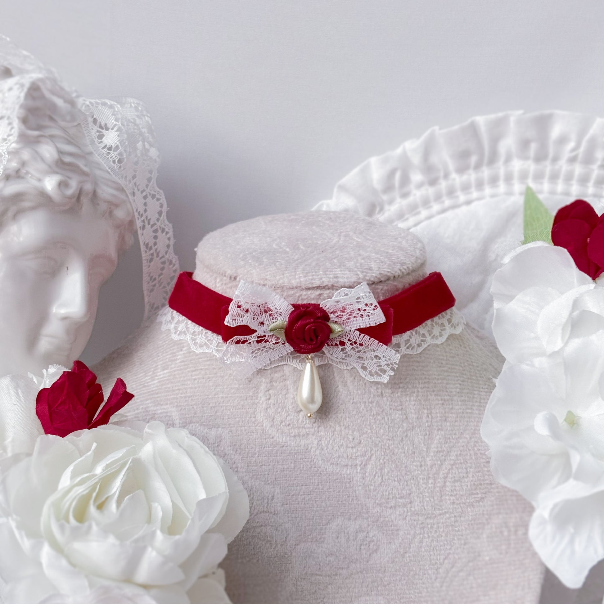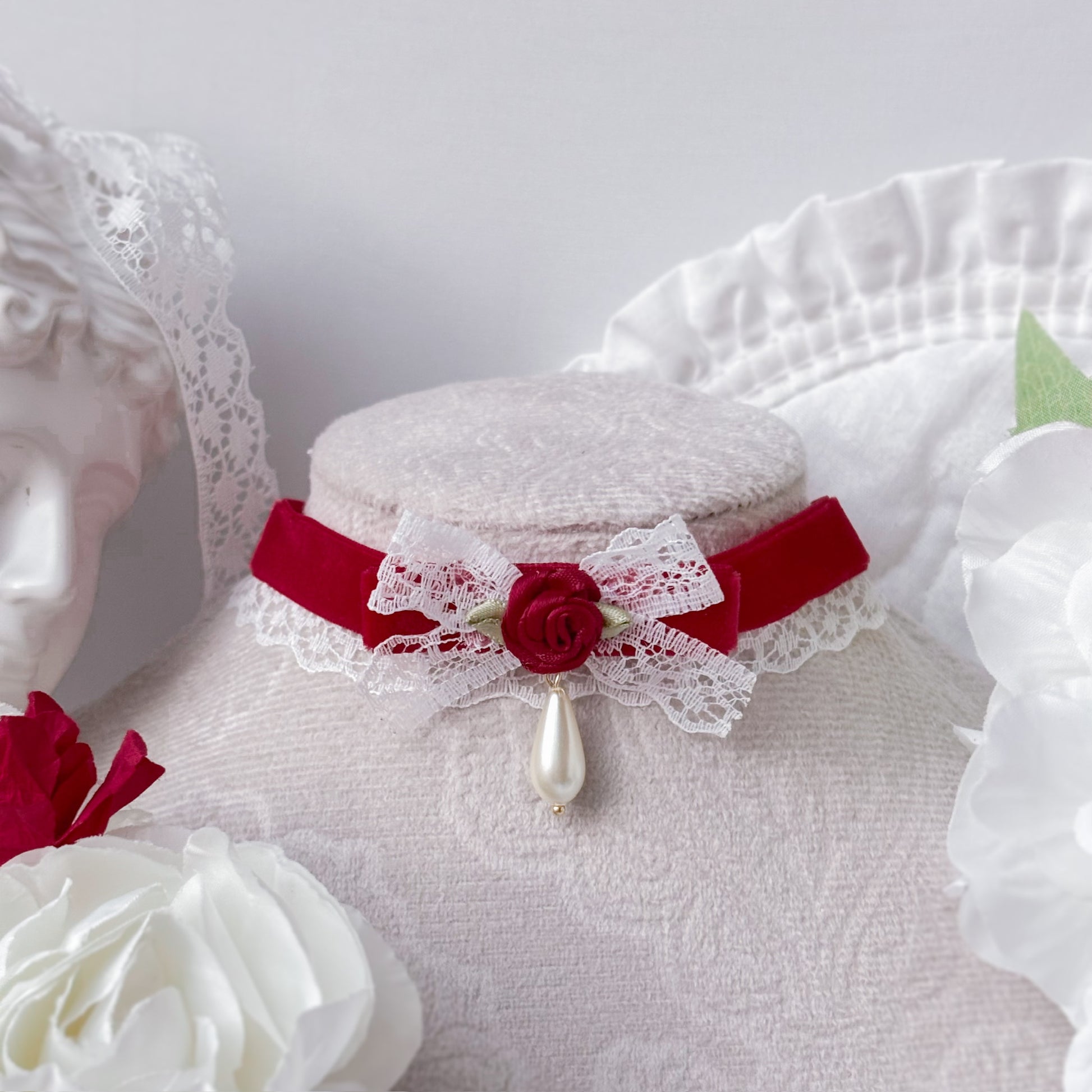 Red velvet choker with lace.
