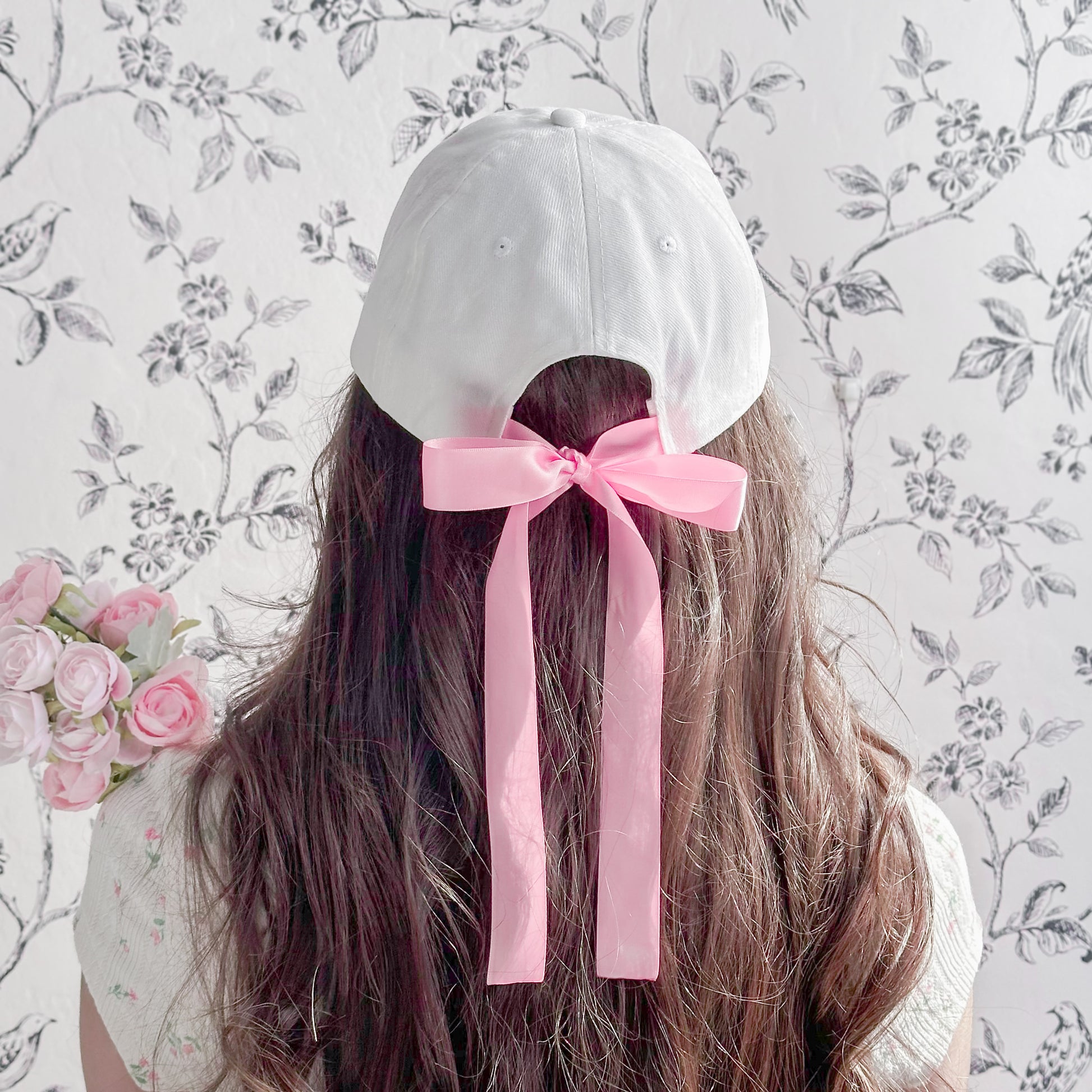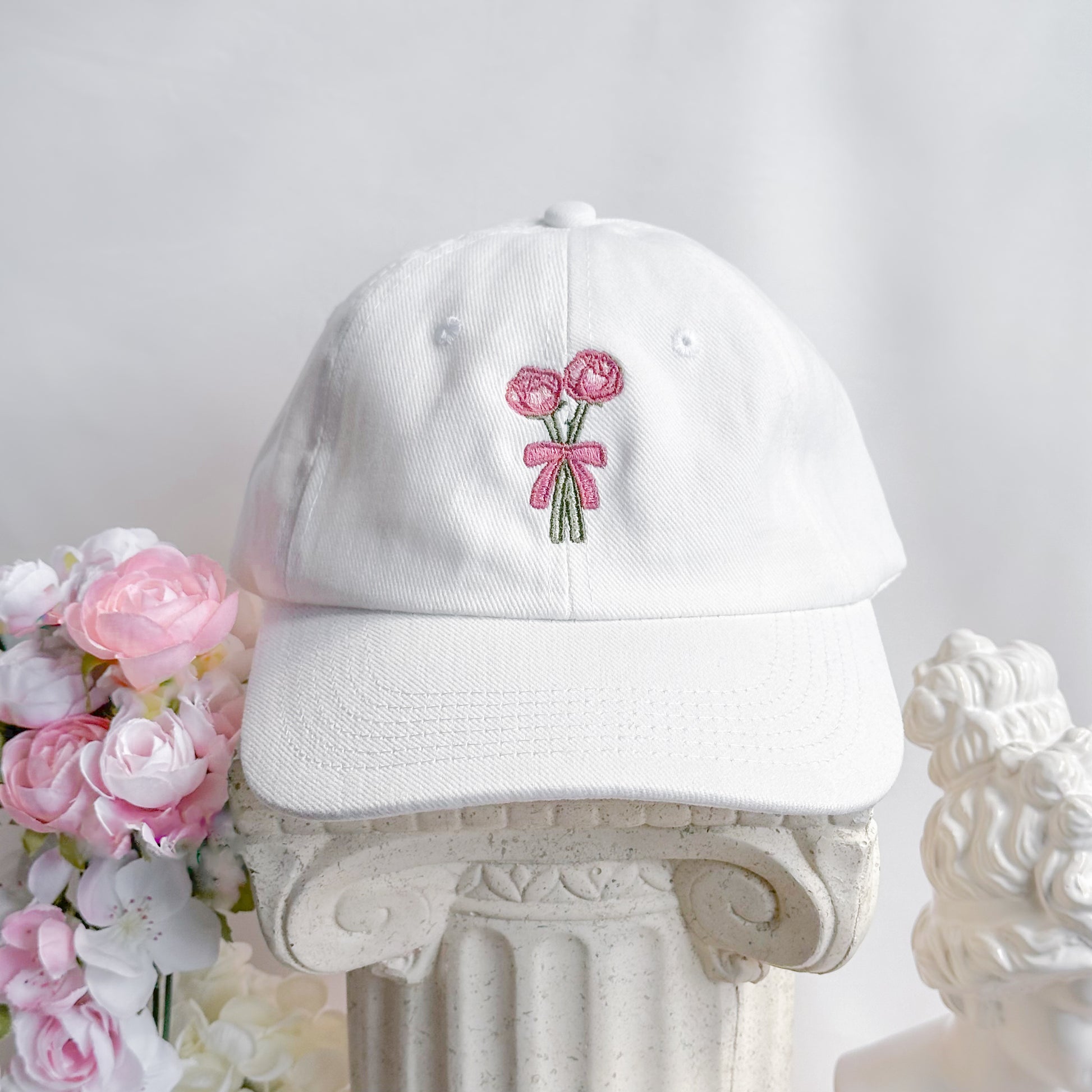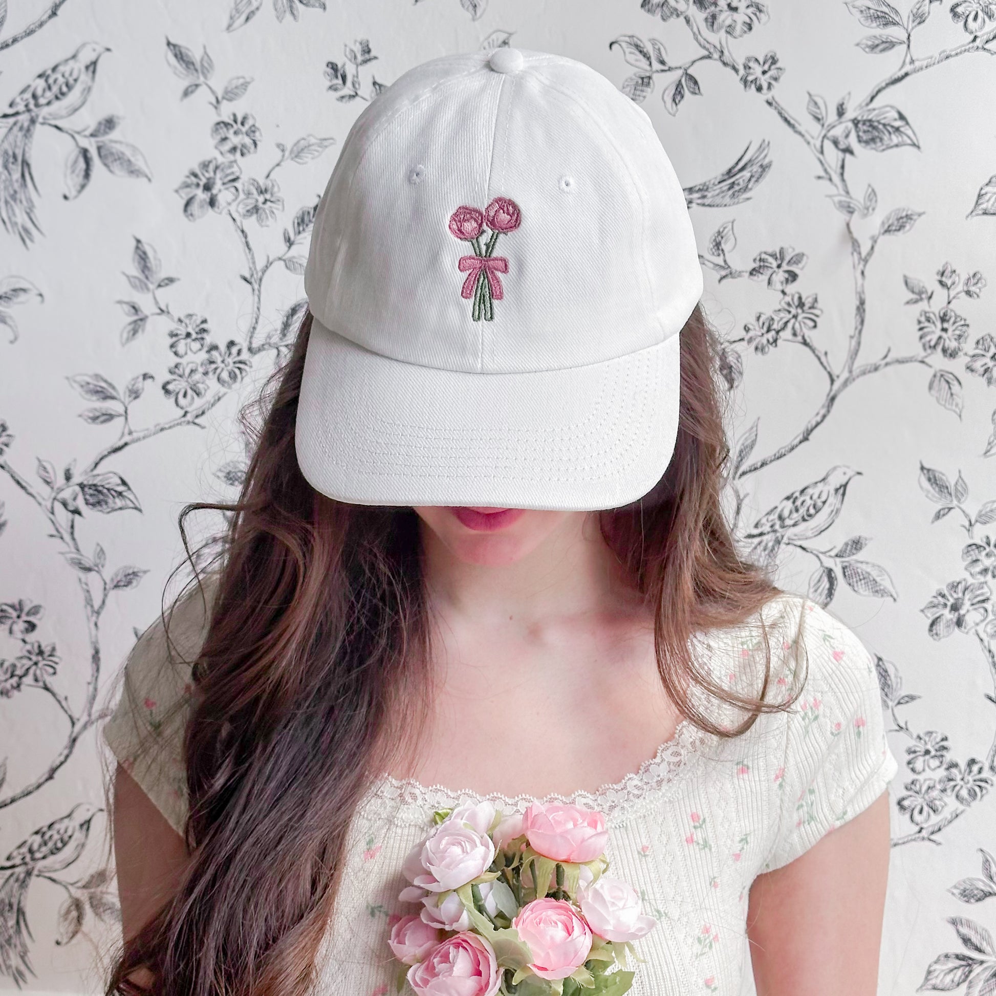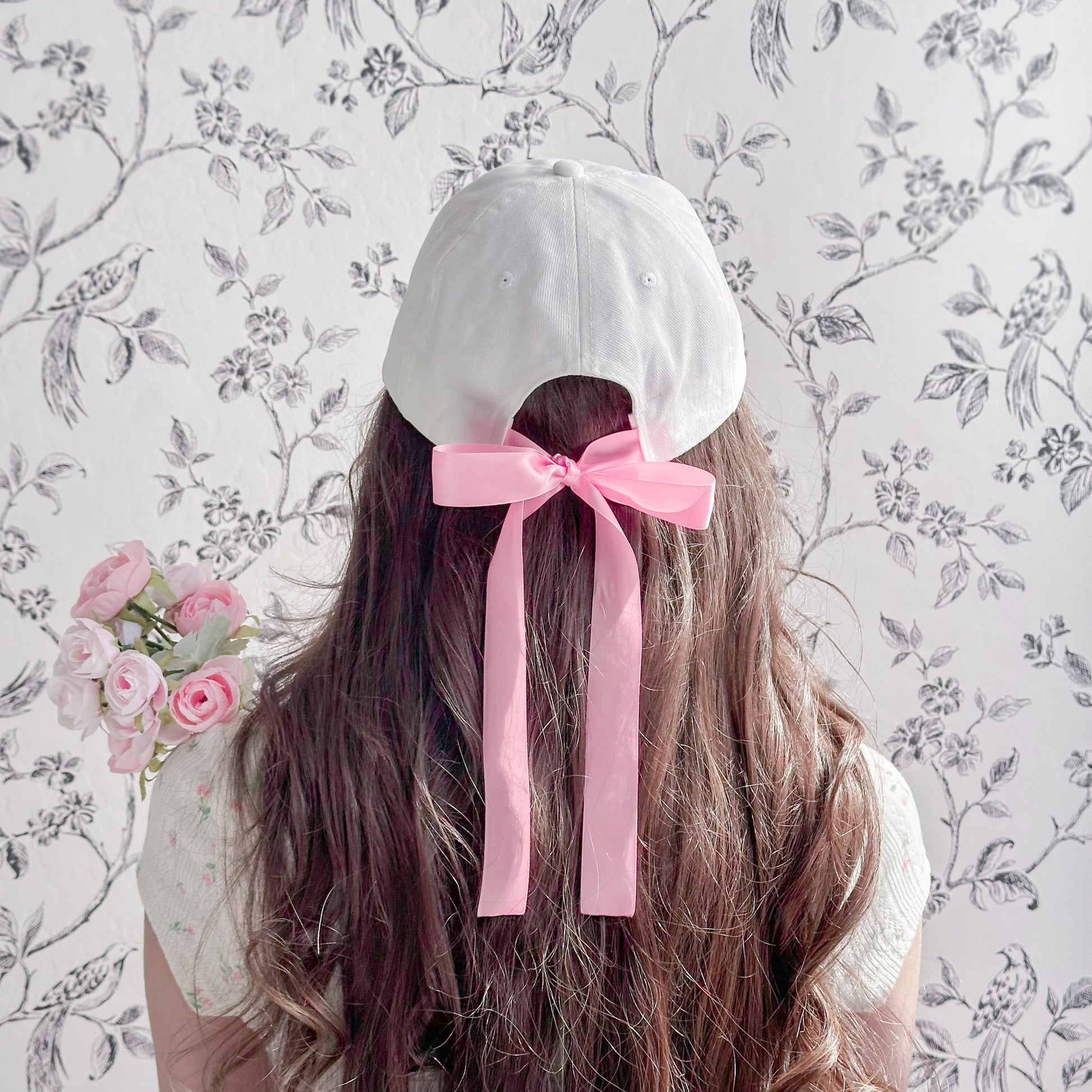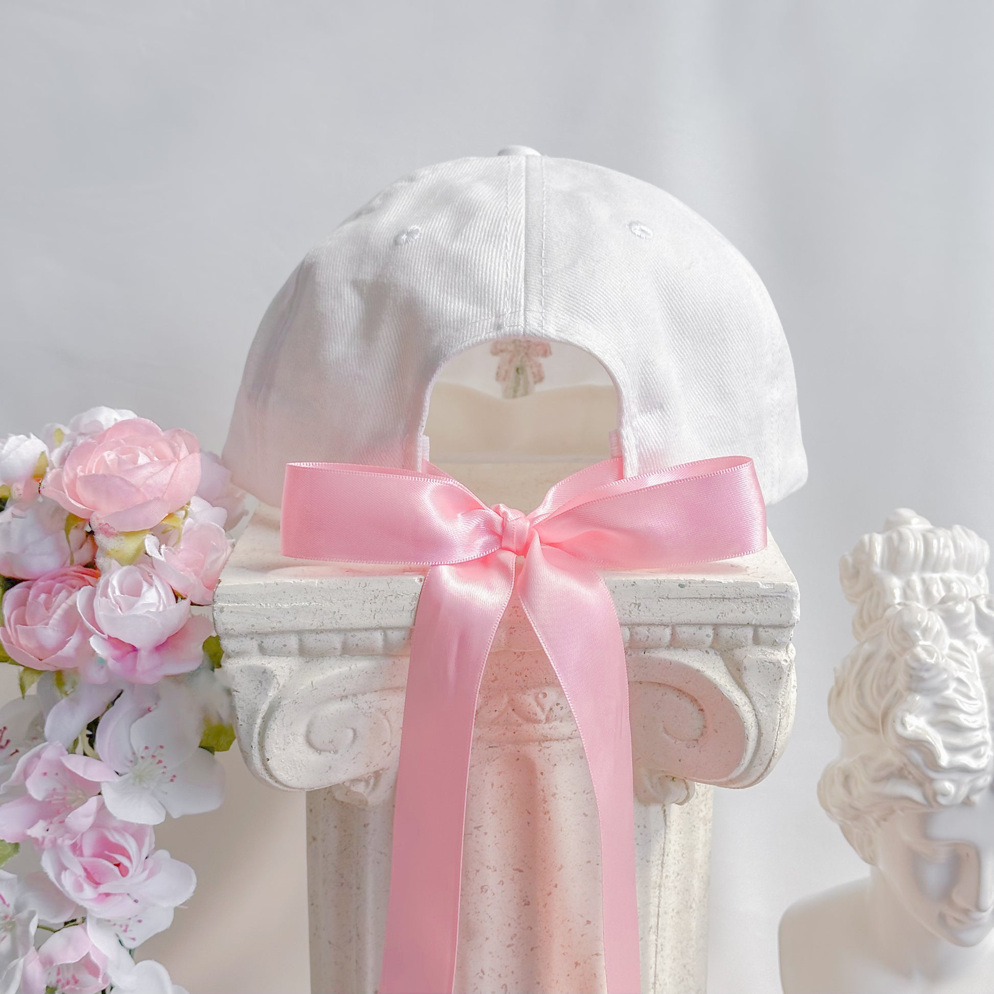 White baseball cap with embroidered floral logo and pink ribbon that ties in the back. Makes for the perfect coquette athleisure!
