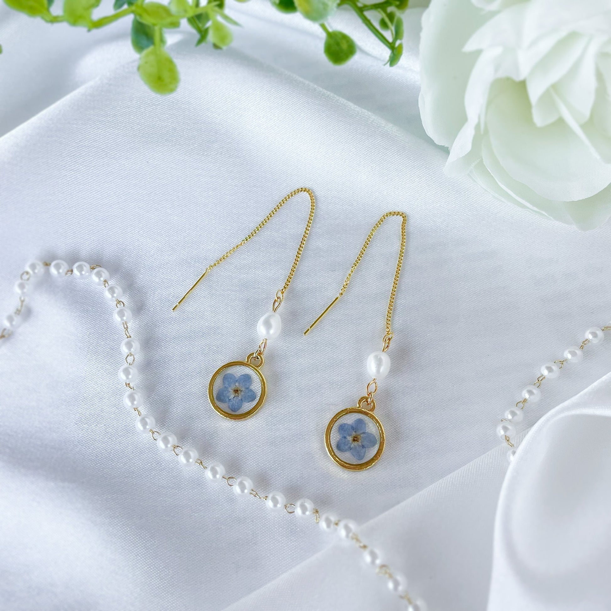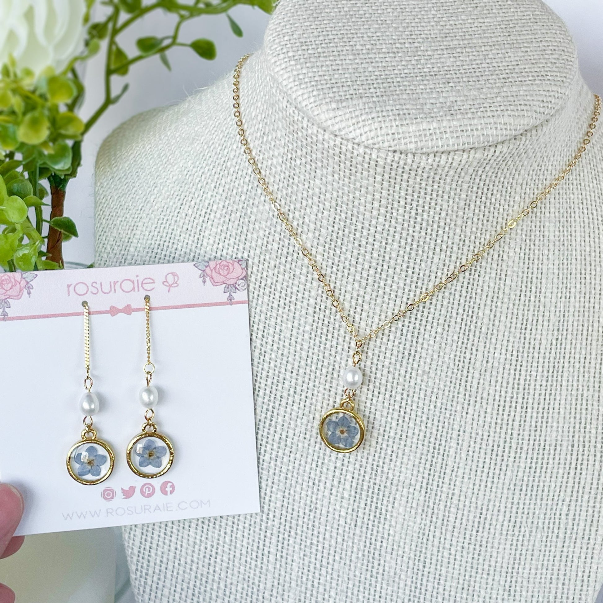 Matching forget-me-not earring and necklace set.