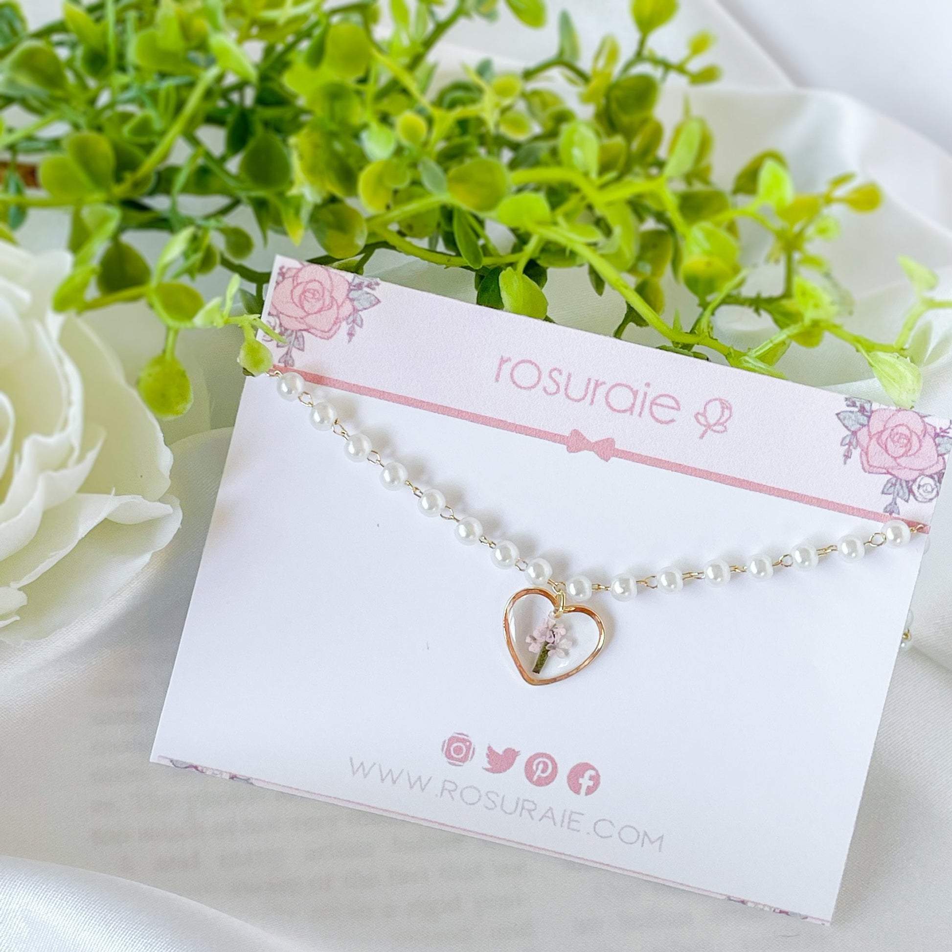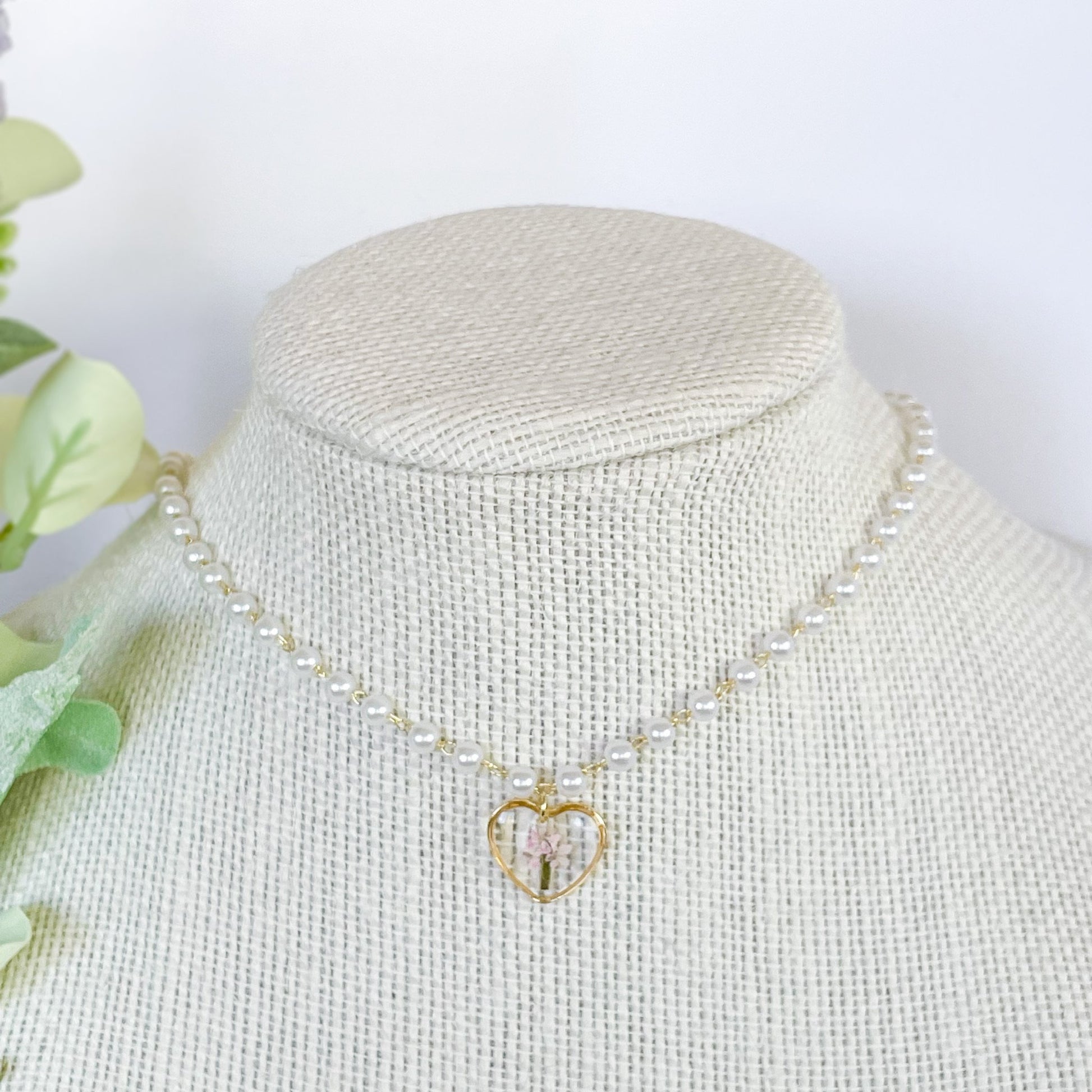 Pearl choker with heart pendant made with dried pink Queen Anne’s Lace.