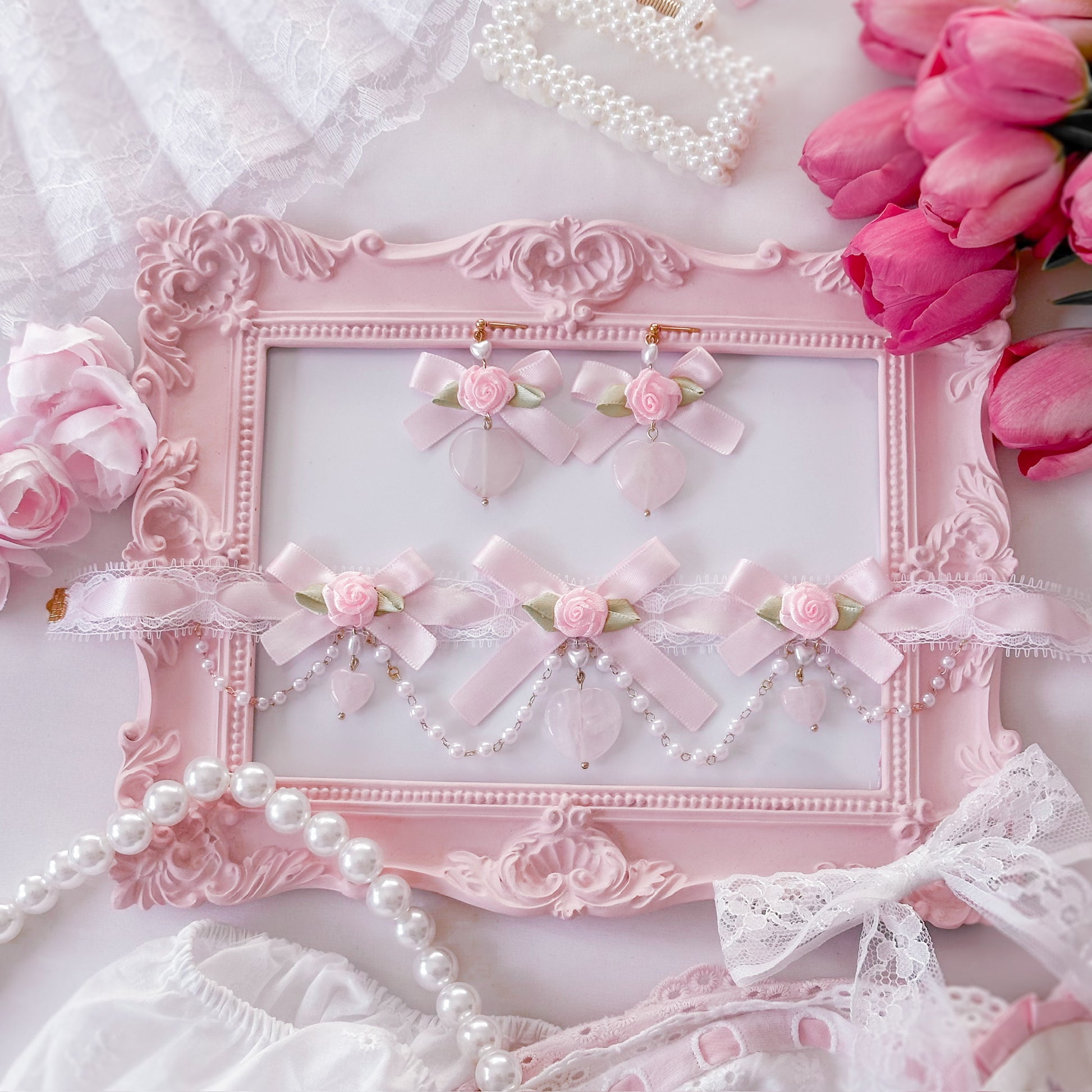 Matching pink satin/lace choker and earring set.