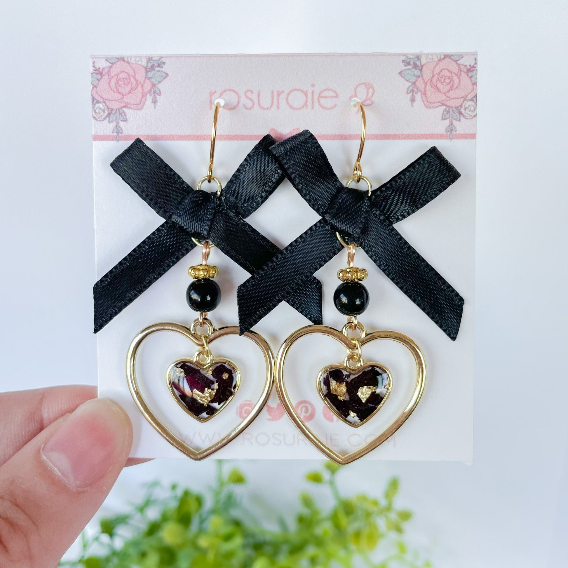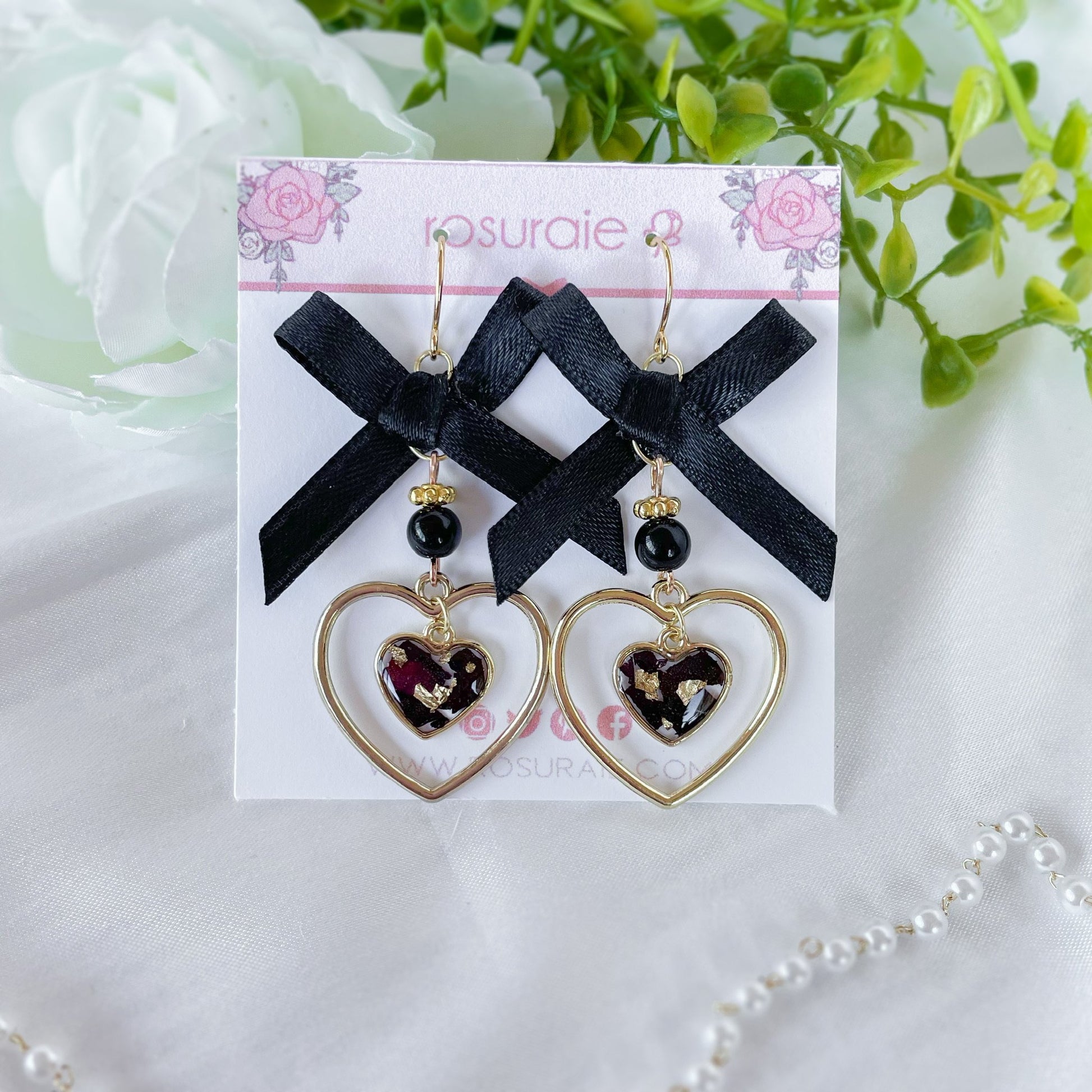Pendants made with real preserved dark purple flower petals and clear bio-resin.
