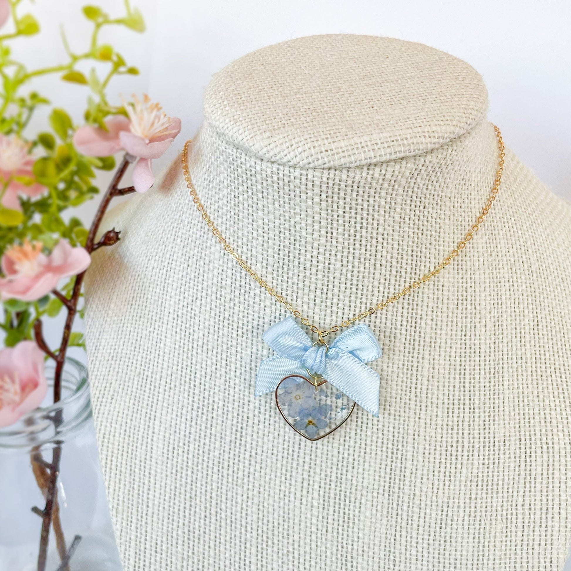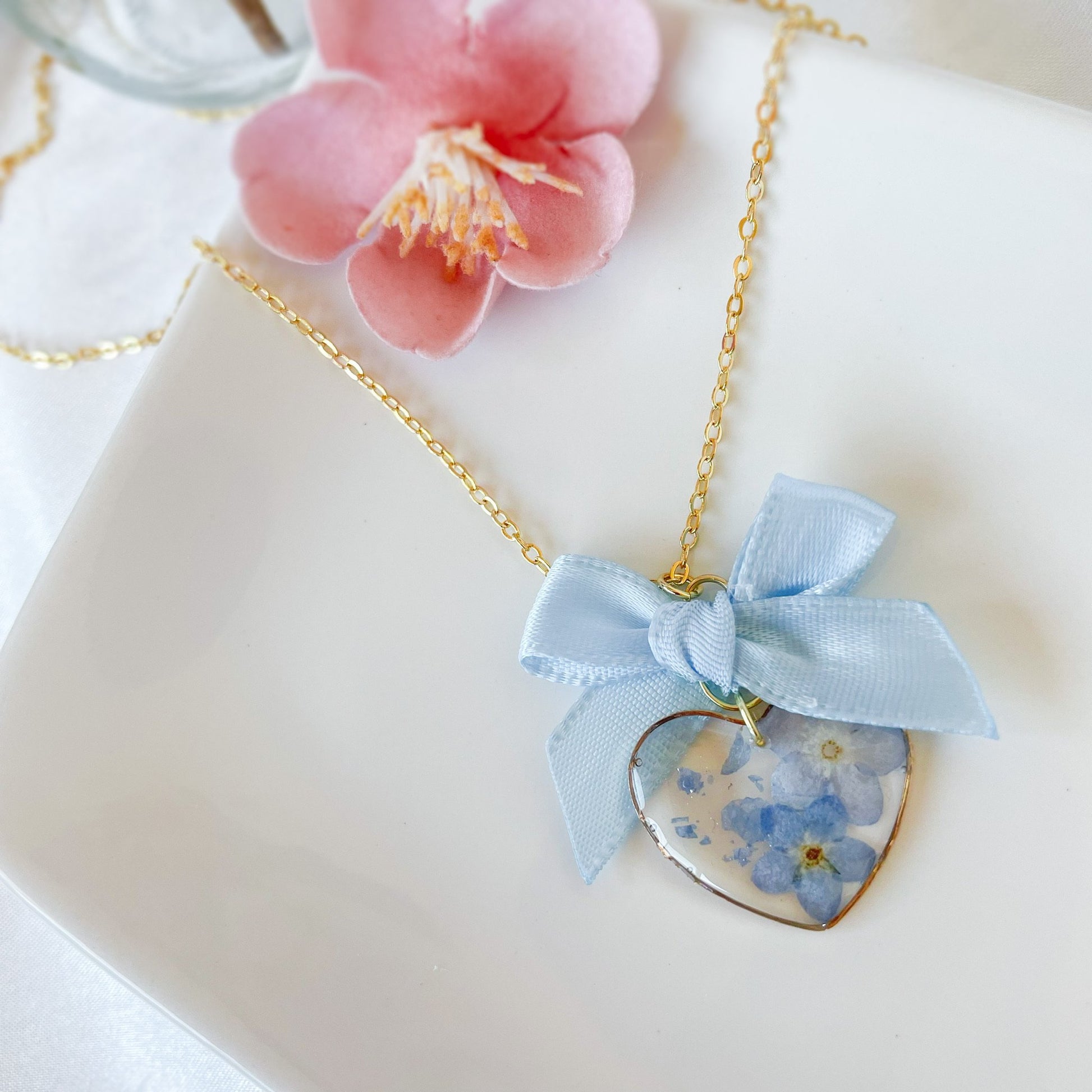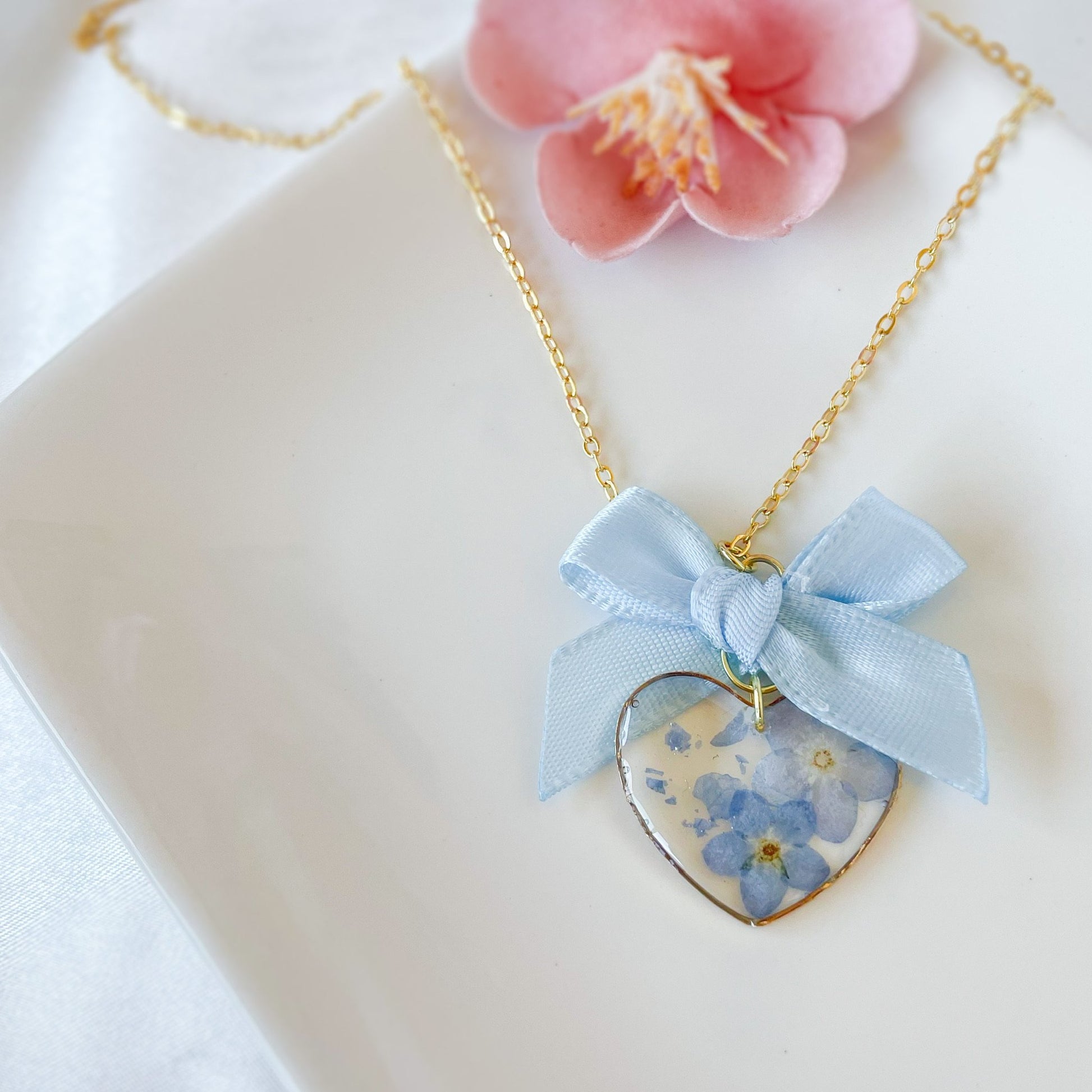 Forget me not necklace with baby blue satin bow.