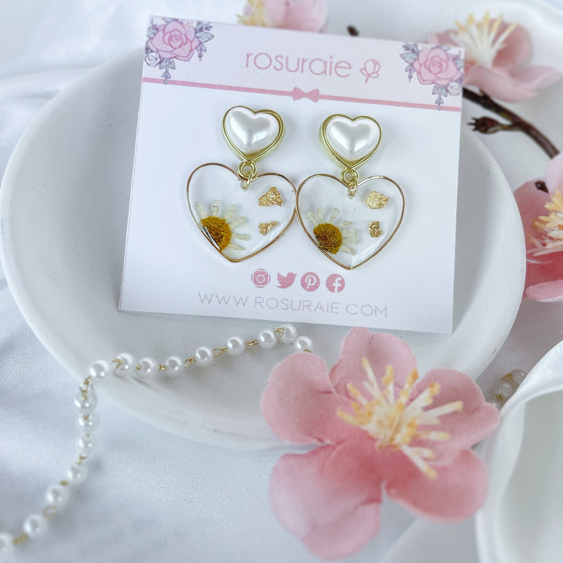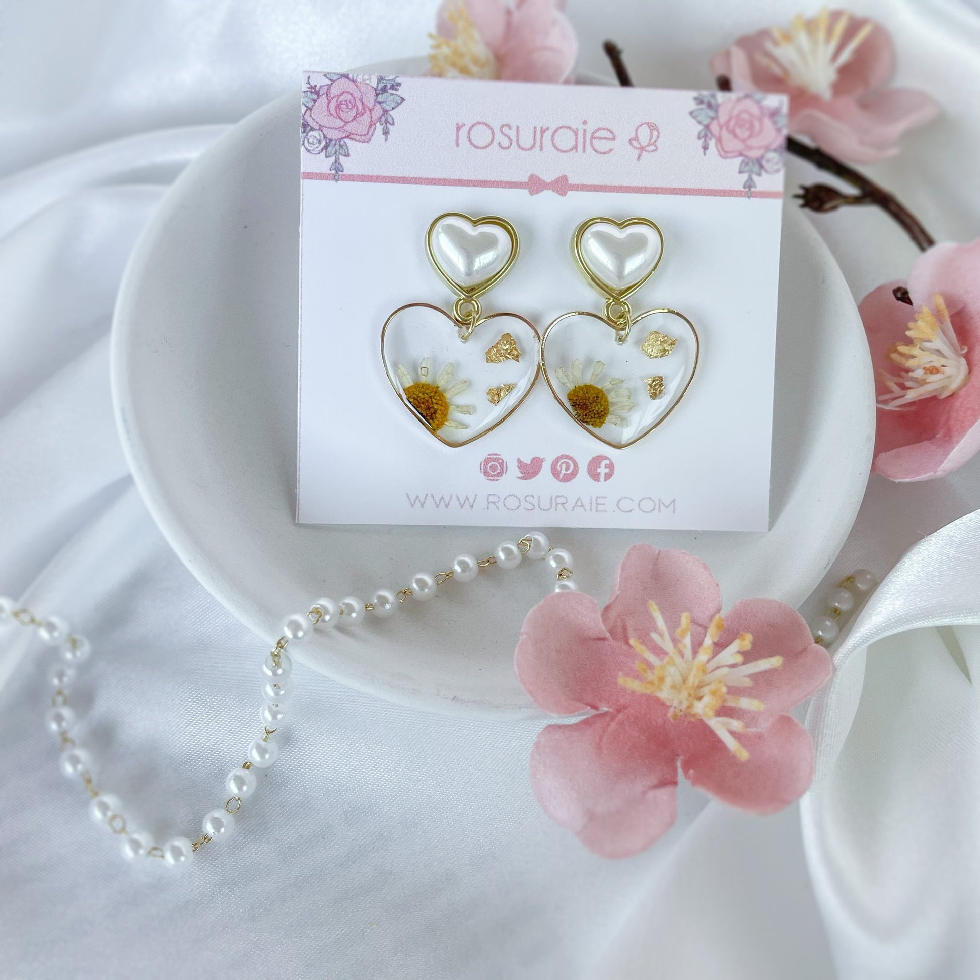 Pearl heart earrings with dried chamomile flowers and gold flakes.