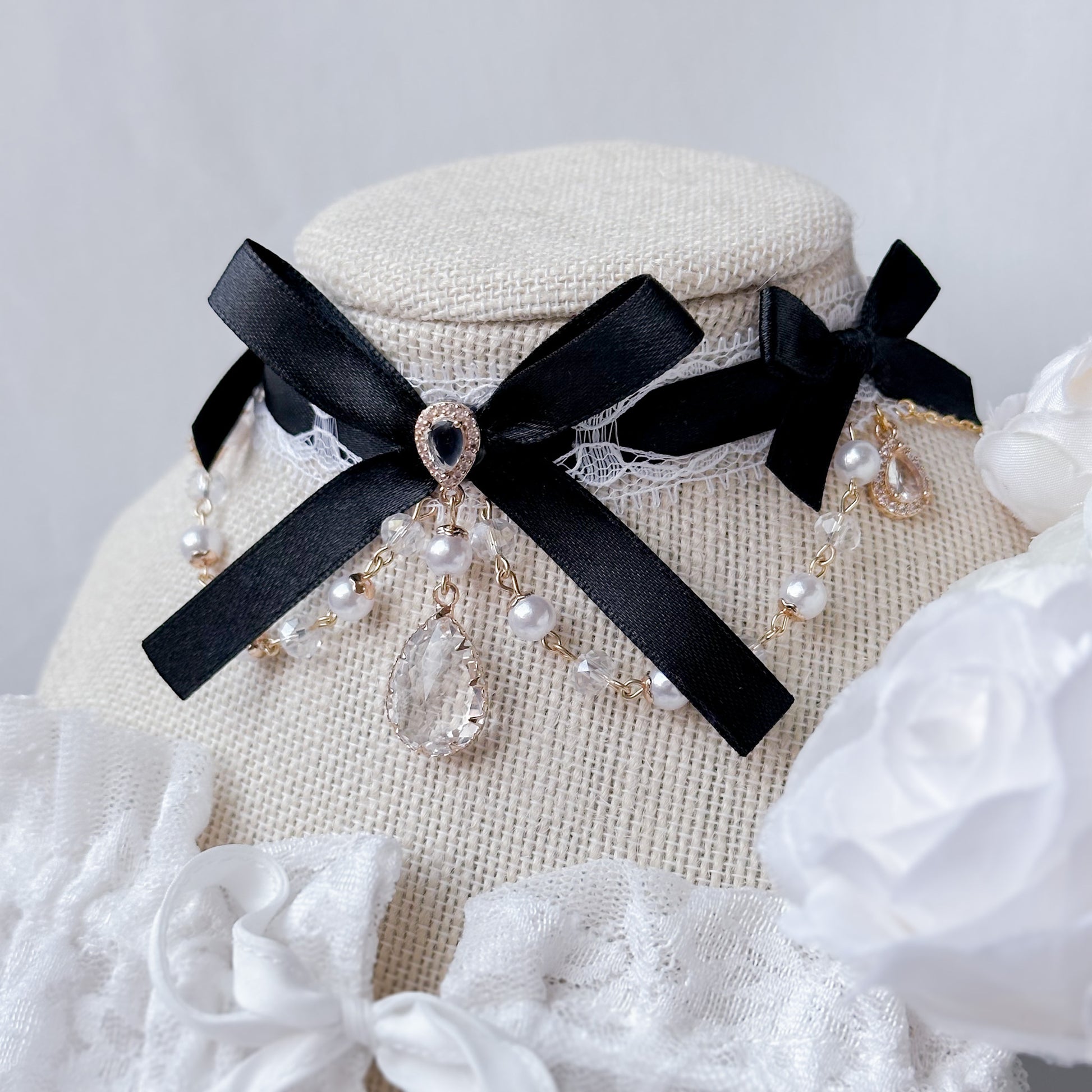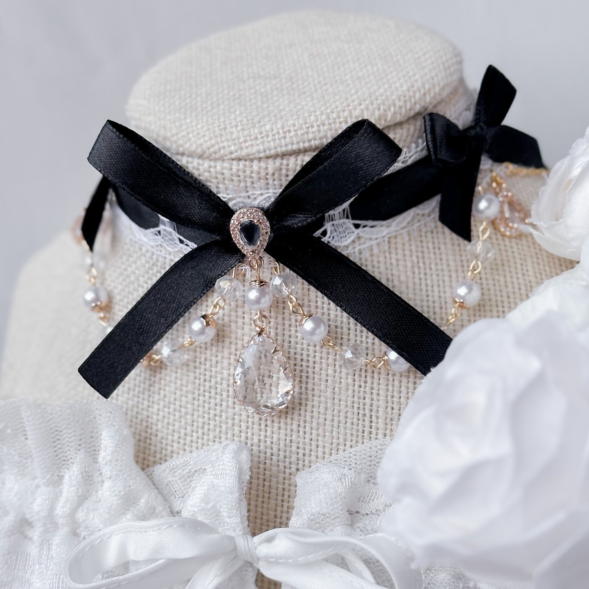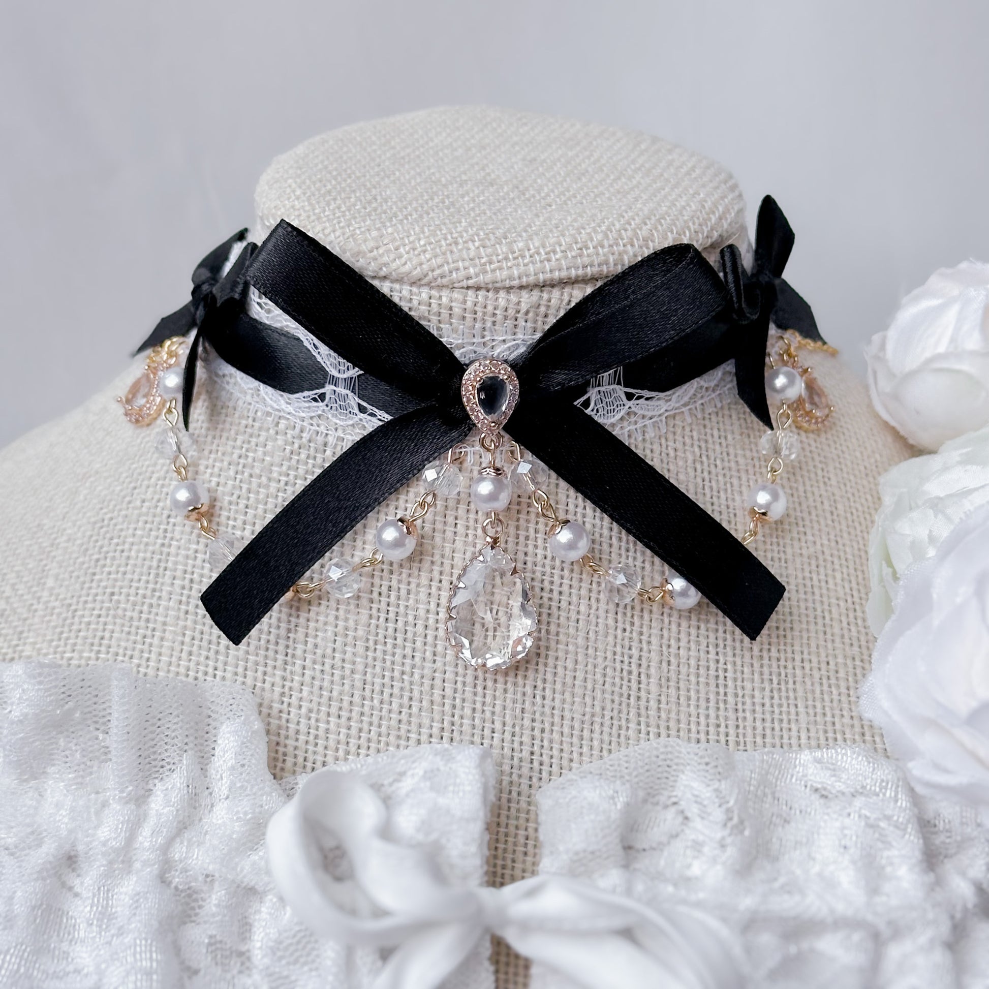 Lace choker with black ribbon.