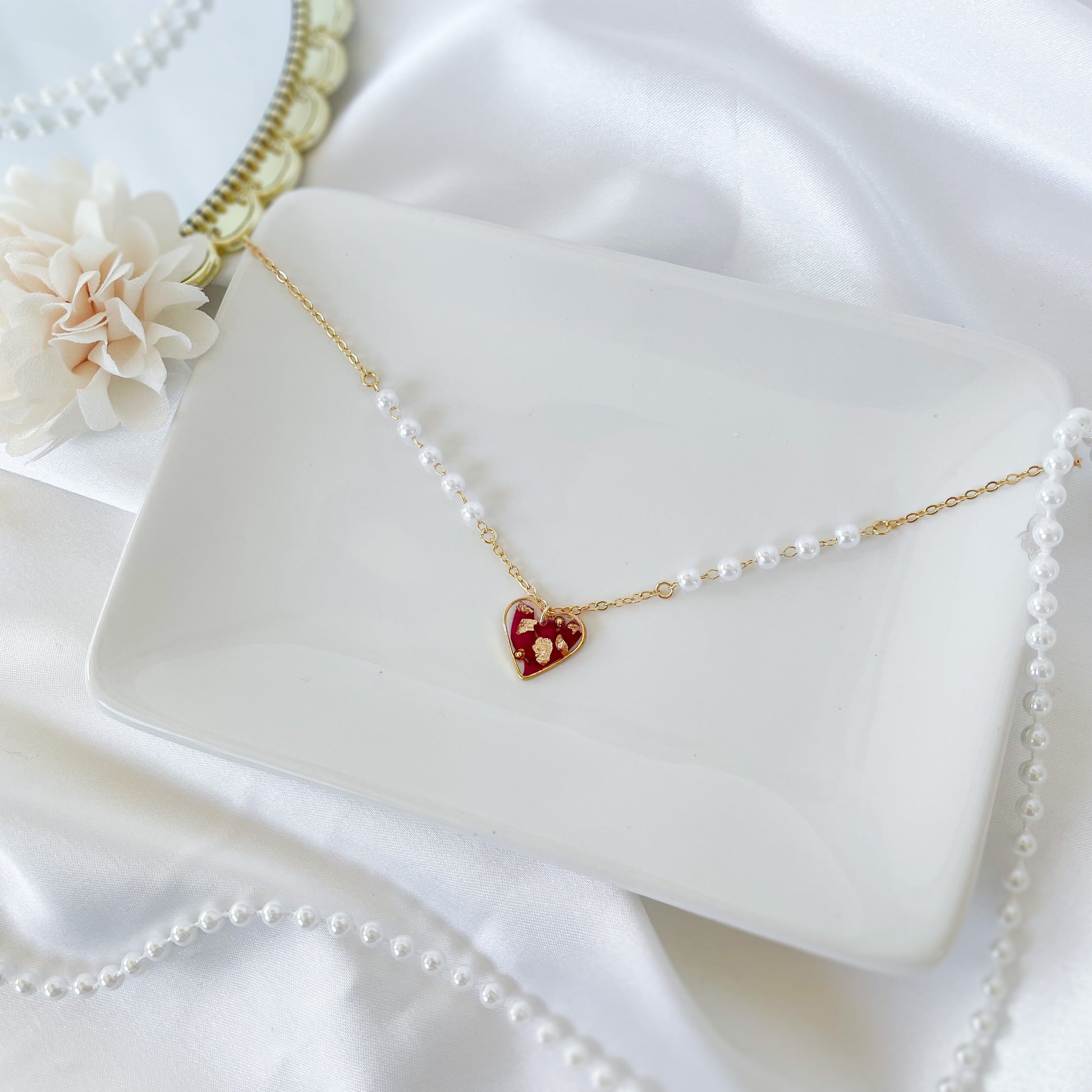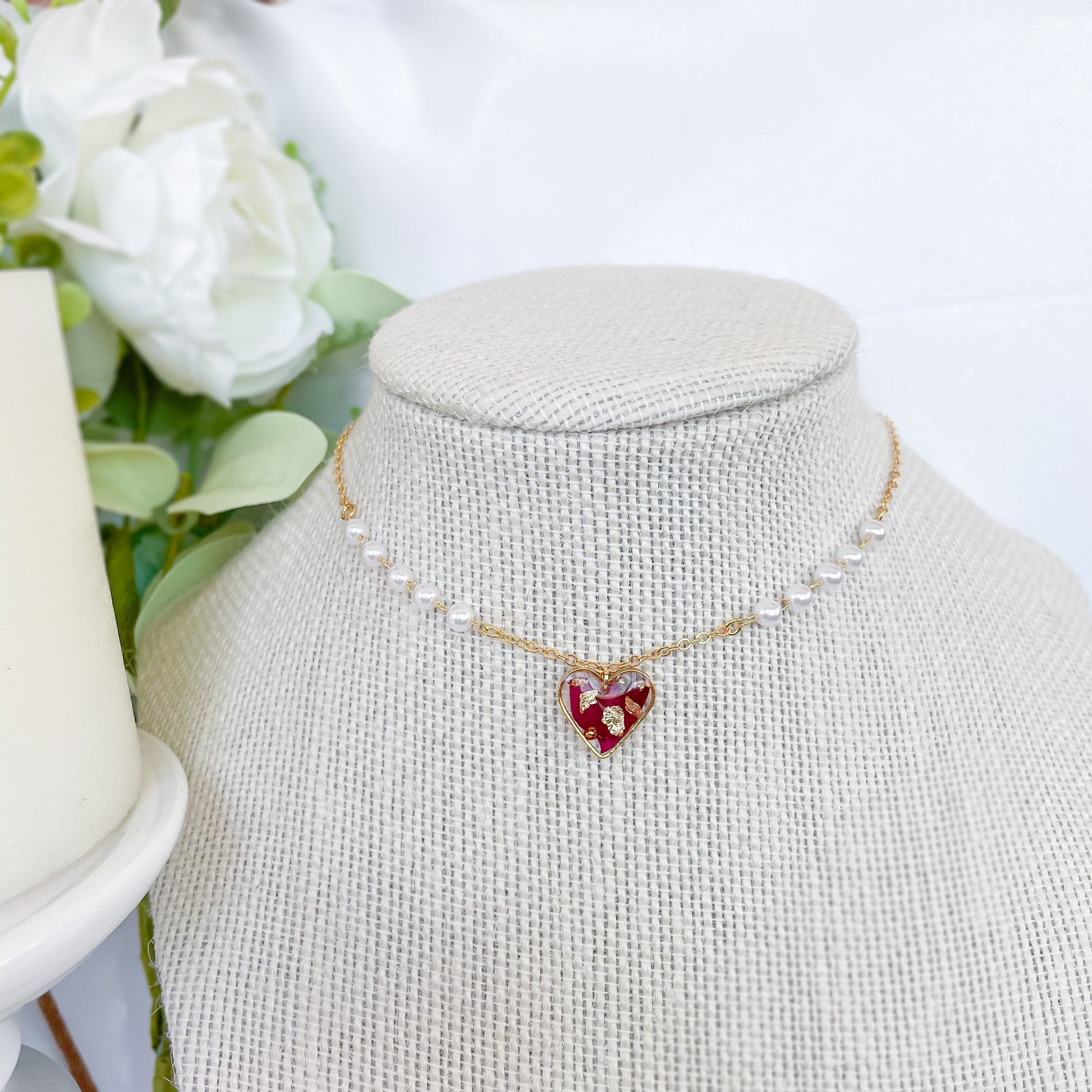 Gold-plated necklace with heart pendant and pearl inclusions.